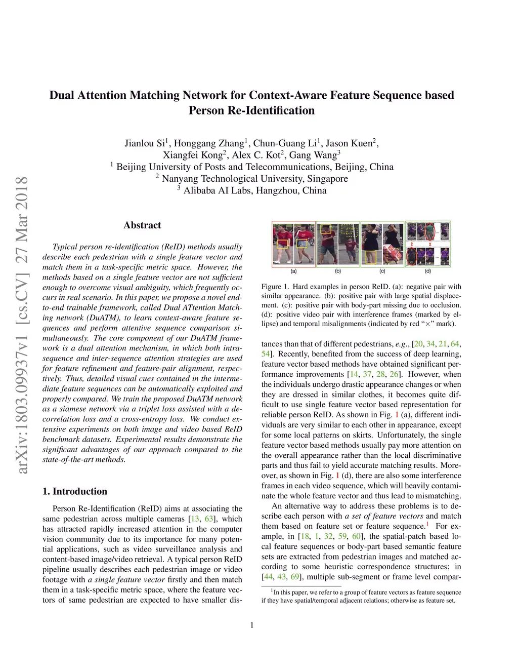 Typical person re-identification (ReID) methods usually describe each pedestrian with a single feature vector and match them in a task-specific metric space. However, the methods based on a single feature vector are not sufficient enough to overcome visual ambiguity, which frequently occurs in real scenario. In this paper, we propose a novel end-to-end trainable framework, called Dual ATtention Matching network (DuATM), to learn context-aware feature sequences and perform attentive sequence comparison simultaneously. The core component of our DuATM framework is a dual attention mechanism, in which both intra-sequence and inter-sequence attention strategies are used for feature refinement and feature-pair alignment, respectively. Thus, detailed visual cues contained in the intermediate feature sequences can be automatically exploited and properly compared. We train the proposed DuATM network as a siamese network via a triplet loss assisted with a de-correlation loss and a cross-entropy loss. We conduct extensive experiments on both image and video based ReID benchmark datasets. Experimental results demonstrate the significant advantages of our approach compared to the state-of-the-art methods.