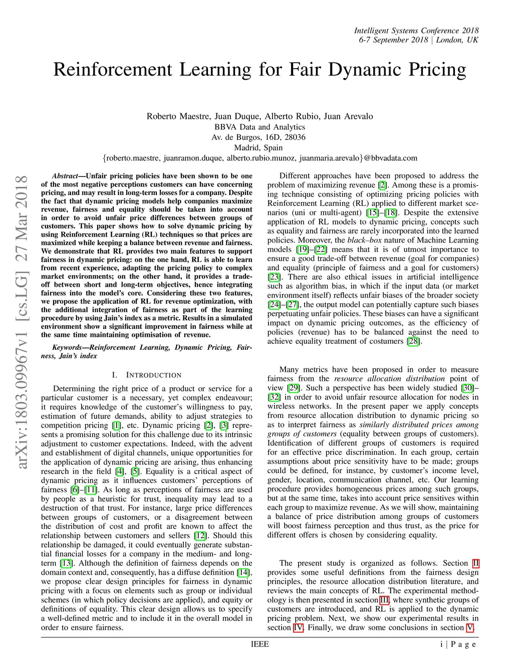 Unfair pricing policies have been shown to be one of the most negative perceptions customers can have concerning pricing, and may result in long-term losses for a company. Despite the fact that dynamic pricing models help companies maximize revenue, fairness and equality should be taken into account in order to avoid unfair price differences between groups of customers. This paper shows how to solve dynamic pricing by using Reinforcement Learning (RL) techniques so that prices are maximized while keeping a balance between revenue and fairness. We demonstrate that RL provides two main features to support fairness in dynamic pricing: on the one hand, RL is able to learn from recent experience, adapting the pricing policy to complex market environments; on the other hand, it provides a trade-off between short and long-term objectives, hence integrating fairness into the model's core. Considering these two features, we propose the application of RL for revenue optimization, with the additional integration of fairness as part of the learning procedure by using Jain's index as a metric. Results in a simulated environment show a significant improvement in fairness while at the same time maintaining optimisation of revenue.