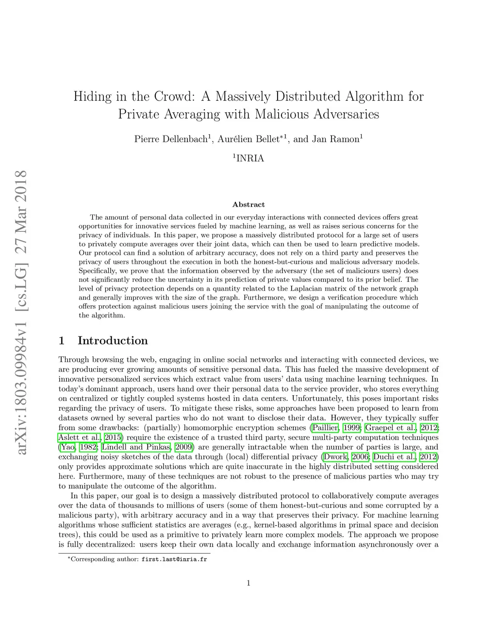 The amount of personal data collected in our everyday interactions with connected devices offers great opportunities for innovative services fueled by machine learning, as well as raises serious concerns for the privacy of individuals. In this paper, we propose a massively distributed protocol for a large set of users to privately compute averages over their joint data, which can then be used to learn predictive models. Our protocol can find a solution of arbitrary accuracy, does not rely on a third party and preserves the privacy of users throughout the execution in both the honest-but-curious and malicious adversary models. Specifically, we prove that the information observed by the adversary (the set of maliciours users) does not significantly reduce the uncertainty in its prediction of private values compared to its prior belief. The level of privacy protection depends on a quantity related to the Laplacian matrix of the network graph and generally improves with the size of the graph. Furthermore, we design a verification procedure which offers protection against malicious users joining the service with the goal of manipulating the outcome of the algorithm.