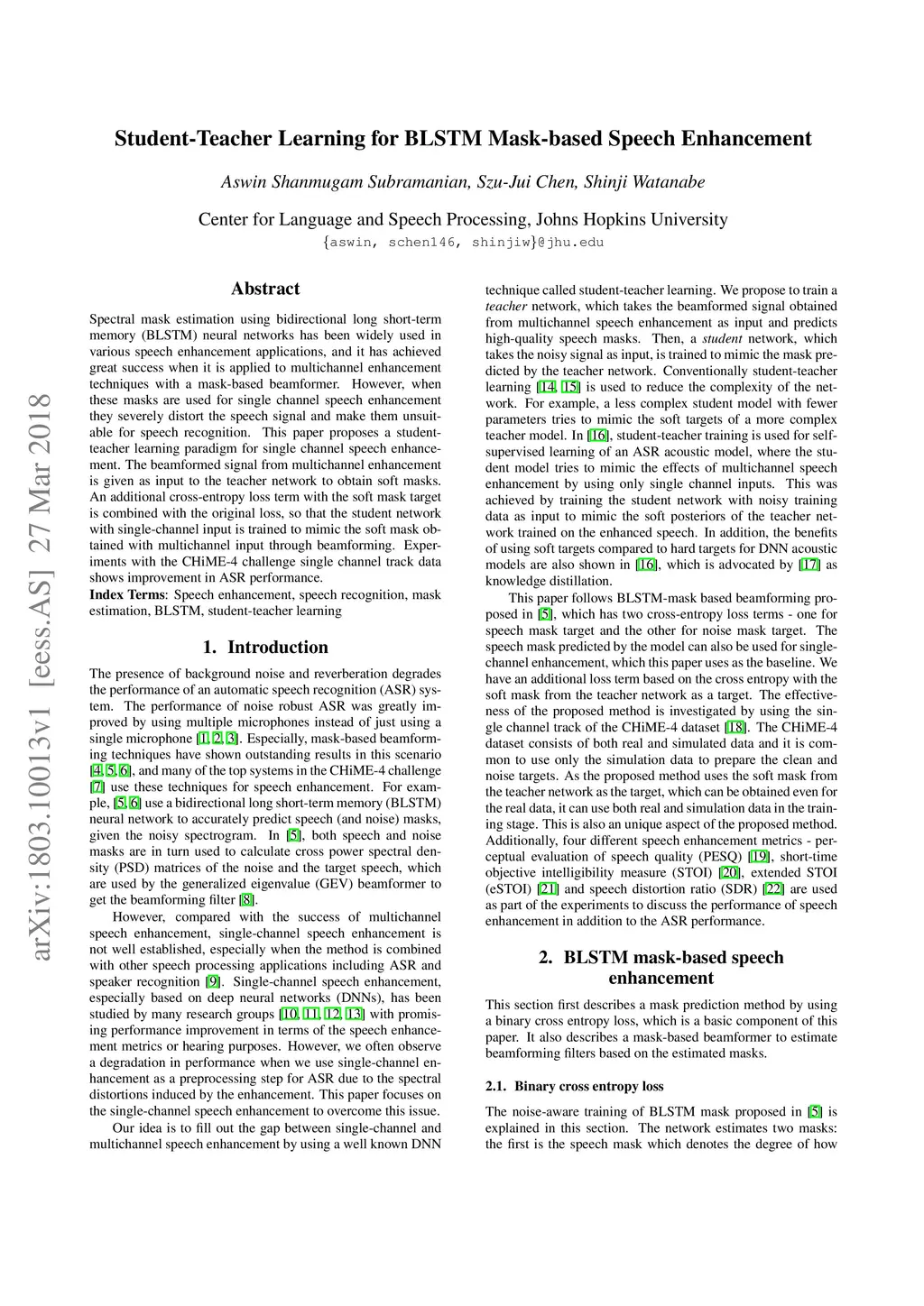 Student-Teacher Learning for BLSTM Mask-based Speech Enhancement