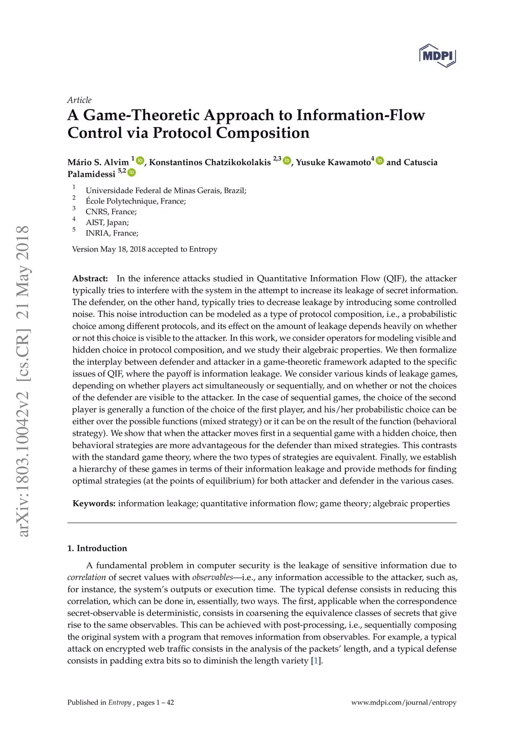 In the inference attacks studied in Quantitative Information Flow (QIF), the attacker typically tries to interfere with the system in the attempt to increase its leakage of secret information. The defender, on the other hand, typically tries to decrease leakage by introducing some controlled noise. This noise introduction can be modeled as a type of protocol composition, i.e., a probabilistic choice among different protocols, and its effect on the amount of leakage depends heavily on whether or not this choice is visible to the attacker. In this work, we consider operators for modeling visible and hidden choice in protocol composition, and we study their algebraic properties. We then formalize the interplay between defender and attacker in a game-theoretic framework adapted to the specific issues of QIF, where the payoff is information leakage. We consider various kinds of leakage games, depending on whether players act simultaneously or sequentially, and on whether or not the choices of the defender are visible to the attacker. In the case of sequential games, the choice of the second player is generally a function of the choice of the first player, and his/her probabilistic choice can be either over the possible functions (mixed strategy) or it can be on the result of the function (behavioral strategy). We show that when the attacker moves first in a sequential game with a hidden choice, then behavioral strategies are more advantageous for the defender than mixed strategies. This contrasts with the standard game theory, where the two types of strategies are equivalent. Finally, we establish a hierarchy of these games in terms of their information leakage and provide methods for finding optimal strategies (at the points of equilibrium) for both attacker and defender in the various cases.