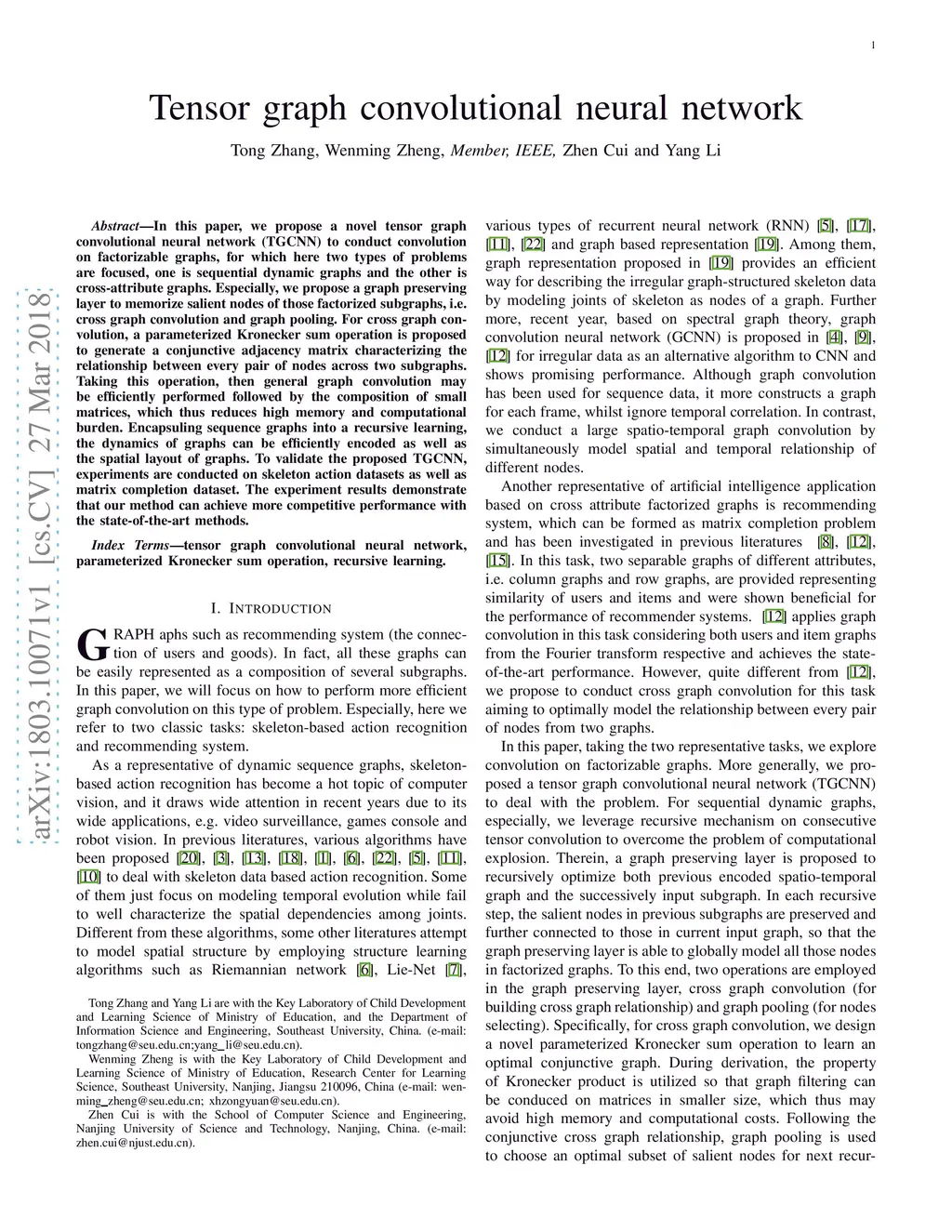 In this paper, we propose a novel tensor graph convolutional neural network (TGCNN) to conduct convolution on factorizable graphs, for which here two types of problems are focused, one is sequential dynamic graphs and the other is cross-attribute graphs. Especially, we propose a graph preserving layer to memorize salient nodes of those factorized subgraphs, i.e. cross graph convolution and graph pooling. For cross graph convolution, a parameterized Kronecker sum operation is proposed to generate a conjunctive adjacency matrix characterizing the relationship between every pair of nodes across two subgraphs. Taking this operation, then general graph convolution may be efficiently performed followed by the composition of small matrices, which thus reduces high memory and computational burden. Encapsuling sequence graphs into a recursive learning, the dynamics of graphs can be efficiently encoded as well as the spatial layout of graphs. To validate the proposed TGCNN, experiments are conducted on skeleton action datasets as well as matrix completion dataset. The experiment results demonstrate that our method can achieve more competitive performance with the state-of-the-art methods.