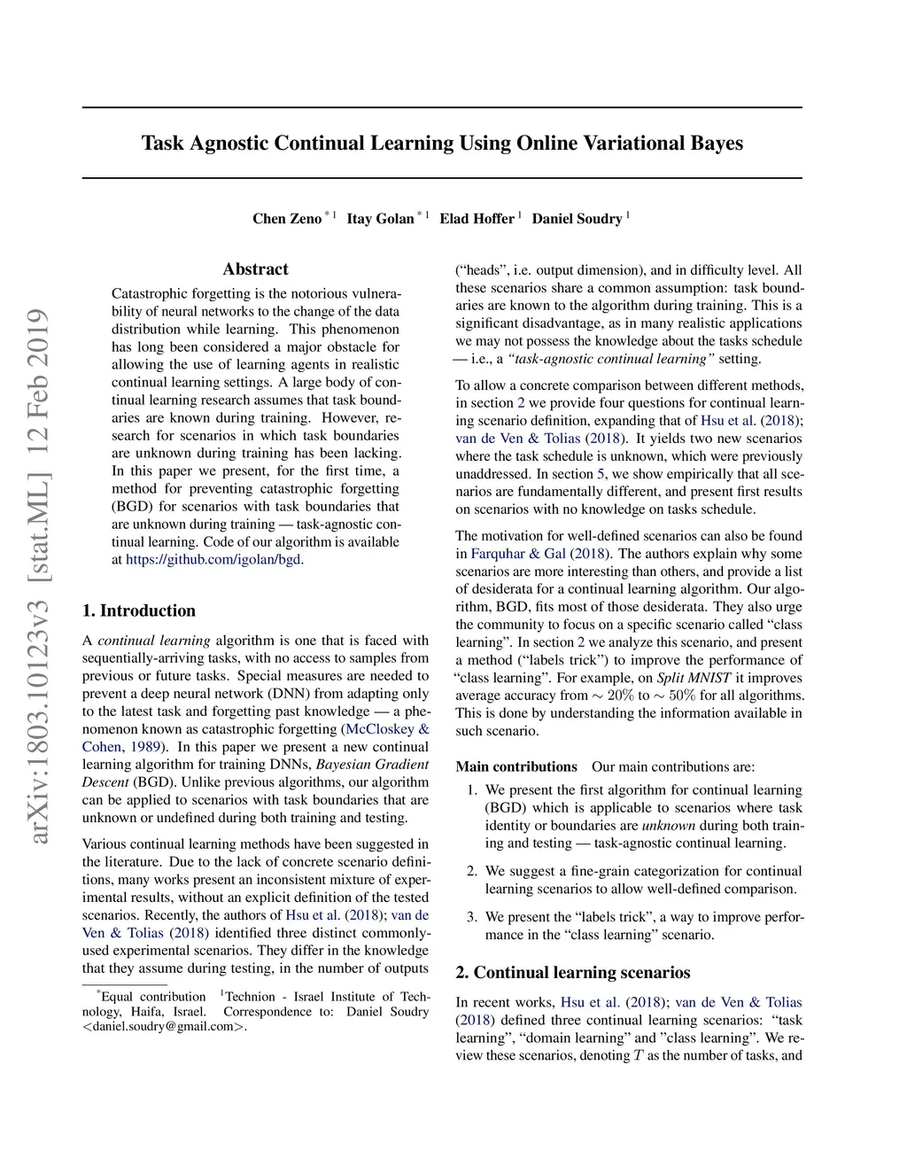 Catastrophic forgetting is the notorious vulnerability of neural networks to the change of the data distribution while learning. This phenomenon has long been considered a major obstacle for allowing the use of learning agents in realistic continual learning settings. A large body of continual learning research assumes that task boundaries are known during training. However, research for scenarios in which task boundaries are unknown during training has been lacking. In this paper we present, for the first time, a method for preventing catastrophic forgetting (BGD) for scenarios with task boundaries that are unknown during training --- task-agnostic continual learning. Code of our algorithm is available at https://github.com/igolan/bgd.