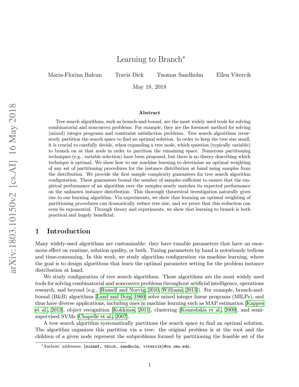 Tree search algorithms, such as branch-and-bound, are the most widely used tools for solving combinatorial and nonconvex problems. For example, they are the foremost method for solving (mixed) integer programs and constraint satisfaction problems. Tree search algorithms recursively partition the search space to find an optimal solution. In order to keep the tree size small, it is crucial to carefully decide, when expanding a tree node, which question (typically variable) to branch on at that node in order to partition the remaining space. Numerous partitioning techniques (e.g., variable selection) have been proposed, but there is no theory describing which technique is optimal. We show how to use machine learning to determine an optimal weighting of any set of partitioning procedures for the instance distribution at hand using samples from the distribution. We provide the first sample complexity guarantees for tree search algorithm configuration. These guarantees bound the number of samples sufficient to ensure that the empirical performance of an algorithm over the samples nearly matches its expected performance on the unknown instance distribution. This thorough theoretical investigation naturally gives rise to our learning algorithm. Via experiments, we show that learning an optimal weighting of partitioning procedures can dramatically reduce tree size, and we prove that this reduction can even be exponential. Through theory and experiments, we show that learning to branch is both practical and hugely beneficial.