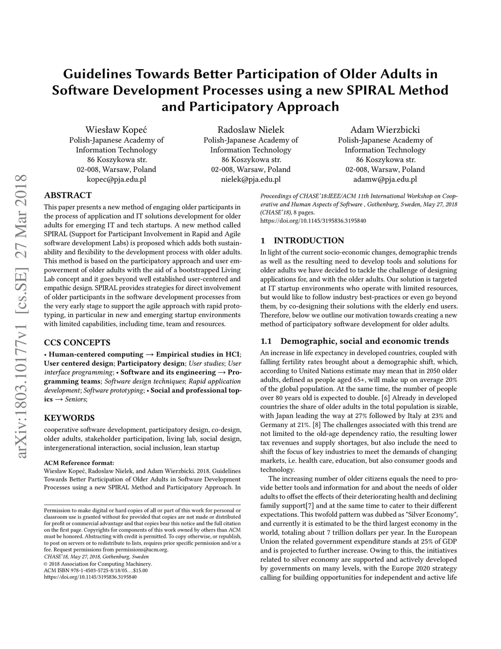 This paper presents a new method of engaging older participants in the process of application and IT solutions development for older adults for emerging IT and tech startups. A new method called SPIRAL (Support for Participant Involvement in Rapid and Agile software development Labs) is proposed which adds both sustainability and flexibility to the development process with older adults. This method is based on the participatory approach and user empowerment of older adults with the aid of a bootstrapped Living Lab concept and it goes beyond well established user-centered and empathic design. SPIRAL provides strategies for direct involvement of older participants in the software development processes from the very early stage to support the agile approach with rapid prototyping, in particular in new and emerging startup environments with limited capabilities, including time, team and resources.
