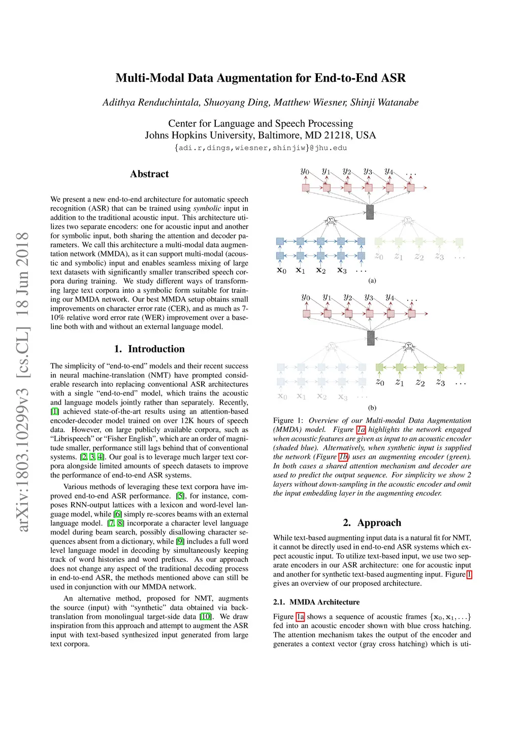We present a new end-to-end architecture for automatic speech recognition (ASR) that can be trained using \emph{symbolic} input in addition to the traditional acoustic input. This architecture utilizes two separate encoders: one for acoustic input and another for symbolic input, both sharing the attention and decoder parameters. We call this architecture a multi-modal data augmentation network (MMDA), as it can support multi-modal (acoustic and symbolic) input and enables seamless mixing of large text datasets with significantly smaller transcribed speech corpora during training. We study different ways of transforming large text corpora into a symbolic form suitable for training our MMDA network. Our best MMDA setup obtains small improvements on character error rate (CER), and as much as 7-10\% relative word error rate (WER) improvement over a baseline both with and without an external language model.