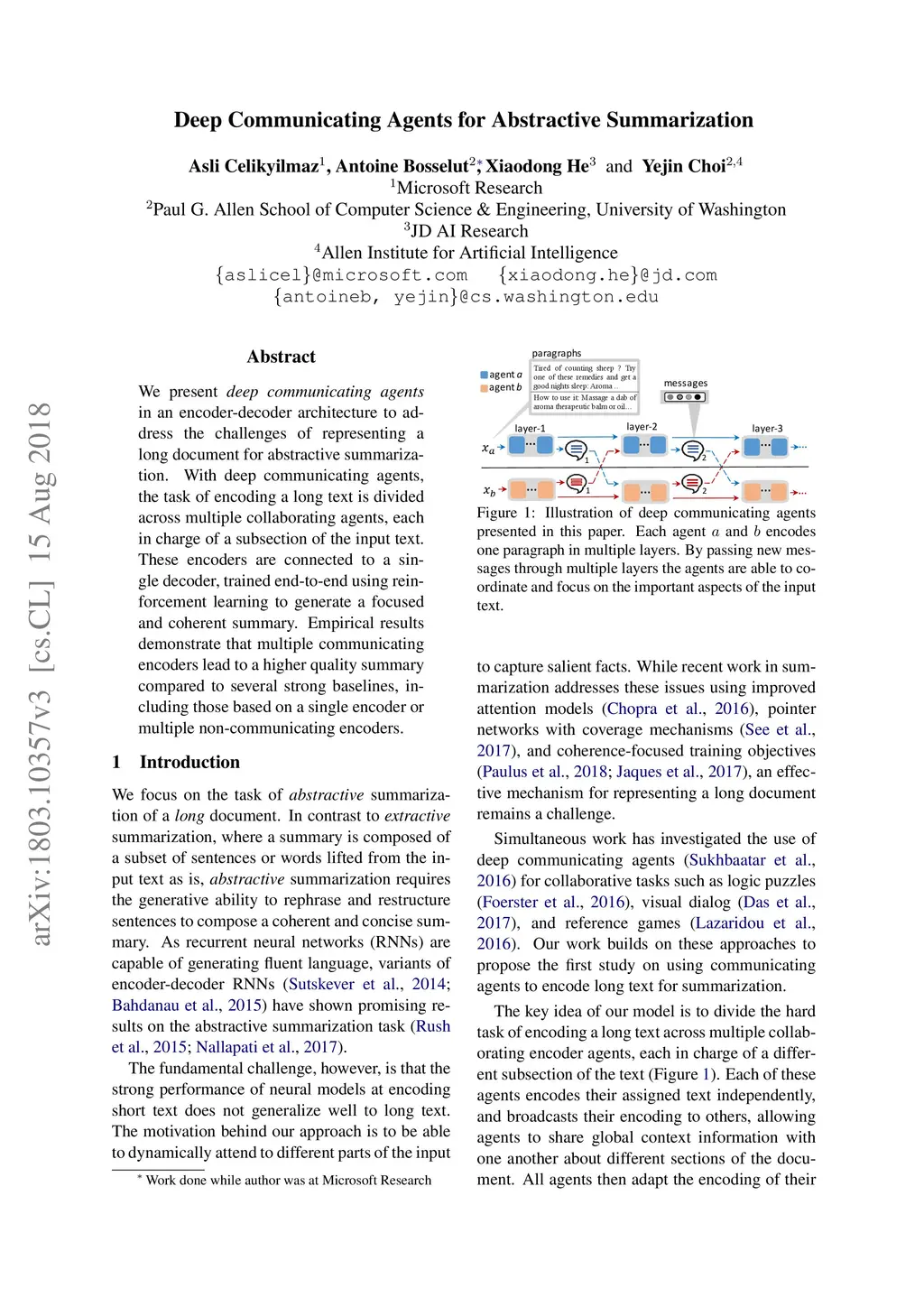 Deep Communicating Agents for Abstractive Summarization
