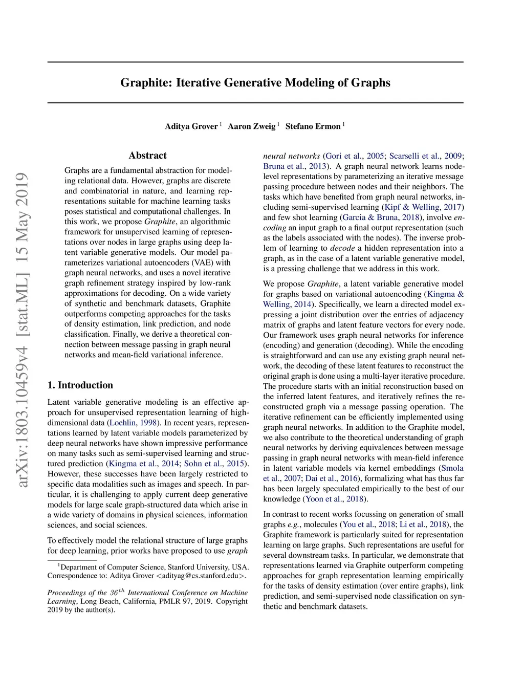 Graphs are a fundamental abstraction for modeling relational data. However, graphs are discrete and combinatorial in nature, and learning representations suitable for machine learning tasks poses statistical and computational challenges. In this work, we propose Graphite, an algorithmic framework for unsupervised learning of representations over nodes in large graphs using deep latent variable generative models. Our model parameterizes variational autoencoders (VAE) with graph neural networks, and uses a novel iterative graph refinement strategy inspired by low-rank approximations for decoding. On a wide variety of synthetic and benchmark datasets, Graphite outperforms competing approaches for the tasks of density estimation, link prediction, and node classification. Finally, we derive a theoretical connection between message passing in graph neural networks and mean-field variational inference.