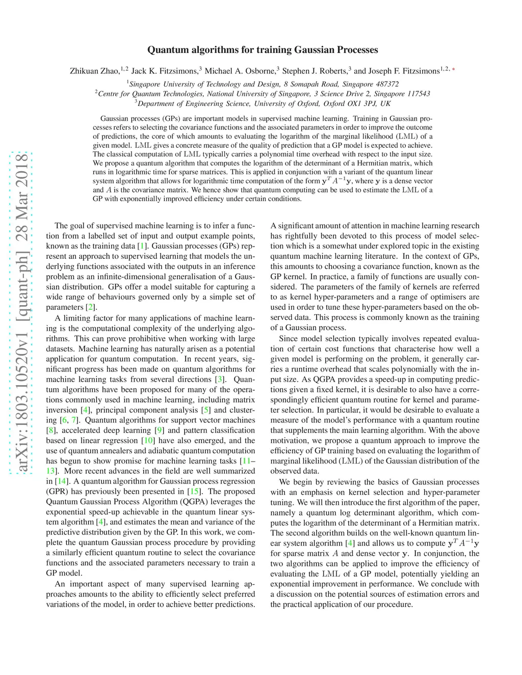 Gaussian processes (GPs) are important models in supervised machine learning. Training in Gaussian processes refers to selecting the covariance functions and the associated parameters in order to improve the outcome of predictions, the core of which amounts to evaluating the logarithm of the marginal likelihood (LML) of a given model. LML gives a concrete measure of the quality of prediction that a GP model is expected to achieve. The classical computation of LML typically carries a polynomial time overhead with respect to the input size. We propose a quantum algorithm that computes the logarithm of the determinant of a Hermitian matrix, which runs in logarithmic time for sparse matrices. This is applied in conjunction with a variant of the quantum linear system algorithm that allows for logarithmic time computation of the form , where is a dense vector and is the covariance matrix. We hence show that quantum computing can be used to estimate the LML of a GP with exponentially improved efficiency under certain conditions.