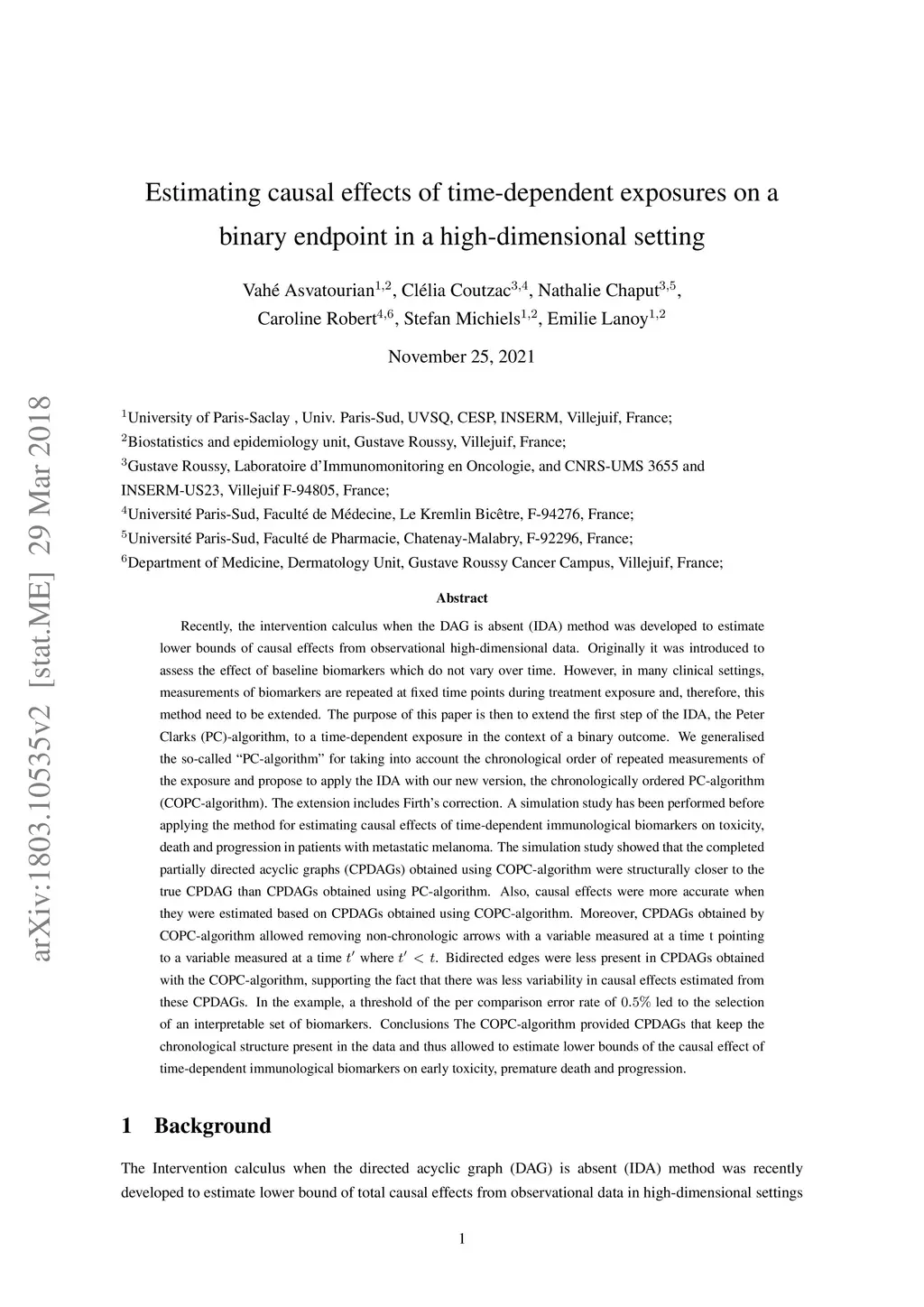 Recently, the intervention calculus when the DAG is absent (IDA) method was developed to estimate lower bounds of causal effects from observational high-dimensional data. Originally it was introduced to assess the effect of baseline biomarkers which do not vary over time. However, in many clinical settings, measurements of biomarkers are repeated at fixed time points during treatment exposure and, therefore, this method need to be extended. The purpose of this paper is then to extend the first step of the IDA, the Peter Clarks (PC)-algorithm, to a time-dependent exposure in the context of a binary outcome. We generalised the PC-algorithm for taking into account the chronological order of repeated measurements of the exposure and propose to apply the IDA with our new version, the chronologically ordered PC-algorithm (COPC-algorithm). A simulation study has been performed before applying the method for estimating causal effects of time-dependent immunological biomarkers on toxicity, death and progression in patients with metastatic melanoma. The simulation study showed that the completed partially directed acyclic graphs (CPDAGs) obtained using COPC-algorithm were structurally closer to the true CPDAG than CPDAGs obtained using PC-algorithm. Also, causal effects were more accurate when they were estimated based on CPDAGs obtained using COPC-algorithm. Moreover, CPDAGs obtained by COPC-algorithm allowed removing non-chronologic arrows with a variable measured at a time t pointing to a variable measured at a time t' where t'< t. Bidirected edges were less present in CPDAGs obtained with the COPC-algorithm, supporting the fact that there was less variability in causal effects estimated from these CPDAGs. The COPC-algorithm provided CPDAGs that keep the chronological structure present in the data, thus allowed to estimate lower bounds of the causal effect of time-dependent biomarkers.