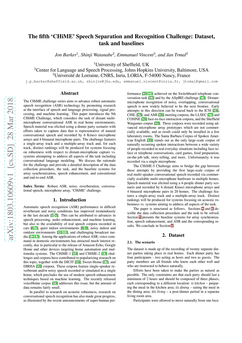 The fifth 'CHiME' Speech Separation and Recognition Challenge: Dataset,