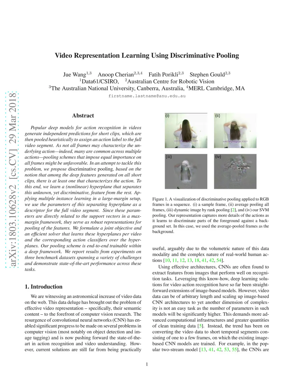 Popular deep models for action recognition in videos generate independent predictions for short clips, which are then pooled heuristically to assign an action label to the full video segment. As not all frames may characterize the underlying action---indeed, many are common across multiple actions---pooling schemes that impose equal importance on all frames might be unfavorable. In an attempt to tackle this problem, we propose discriminative pooling, based on the notion that among the deep features generated on all short clips, there is at least one that characterizes the action. To this end, we learn a (nonlinear) hyperplane that separates this unknown, yet discriminative, feature from the rest. Applying multiple instance learning in a large-margin setup, we use the parameters of this separating hyperplane as a descriptor for the full video segment. Since these parameters are directly related to the support vectors in a max-margin framework, they serve as robust representations for pooling of the features. We formulate a joint objective and an efficient solver that learns these hyperplanes per video and the corresponding action classifiers over the hyperplanes. Our pooling scheme is end-to-end trainable within a deep framework. We report results from experiments on three benchmark datasets spanning a variety of challenges and demonstrate state-of-the-art performance across these tasks.