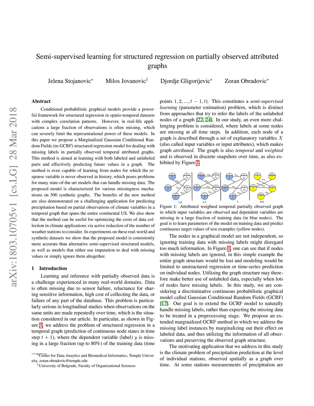Conditional probabilistic graphical models provide a powerful framework for structured regression in spatio-temporal datasets with complex correlation patterns. However, in real-life applications a large fraction of observations is often missing, which can severely limit the representational power of these models. In this paper we propose a Marginalized Gaussian Conditional Random Fields (m-GCRF) structured regression model for dealing with missing labels in partially observed temporal attributed graphs. This method is aimed at learning with both labeled and unlabeled parts and effectively predicting future values in a graph. The method is even capable of learning from nodes for which the response variable is never observed in history, which poses problems for many state-of-the-art models that can handle missing data. The proposed model is characterized for various missingness mechanisms on 500 synthetic graphs. The benefits of the new method are also demonstrated on a challenging application for predicting precipitation based on partial observations of climate variables in a temporal graph that spans the entire continental US. We also show that the method can be useful for optimizing the costs of data collection in climate applications via active reduction of the number of weather stations to consider. In experiments on these real-world and synthetic datasets we show that the proposed model is consistently more accurate than alternative semi-supervised structured models, as well as models that either use imputation to deal with missing values or simply ignore them altogether.