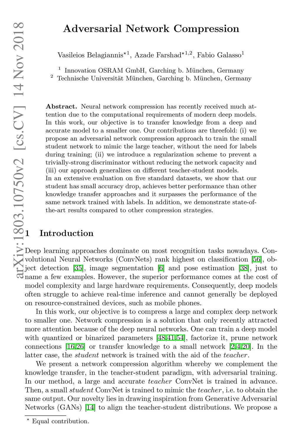 Neural network compression has recently received much attention due to the computational requirements of modern deep models. In this work, our objective is to transfer knowledge from a deep and accurate model to a smaller one. Our contributions are threefold: (i) we propose an adversarial network compression approach to train the small student network to mimic the large teacher, without the need for labels during training; (ii) we introduce a regularization scheme to prevent a trivially-strong discriminator without reducing the network capacity and (iii) our approach generalizes on different teacher-student models. In an extensive evaluation on five standard datasets, we show that our student has small accuracy drop, achieves better performance than other knowledge transfer approaches and it surpasses the performance of the same network trained with labels. In addition, we demonstrate state-of-the-art results compared to other compression strategies.