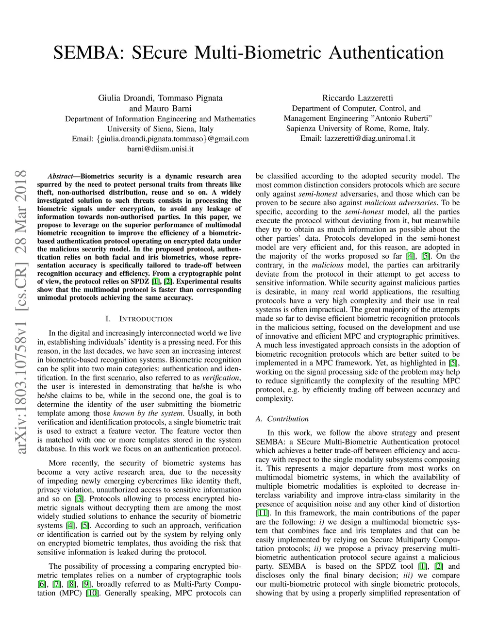 SEMBA:SEcure multi-biometric authentication