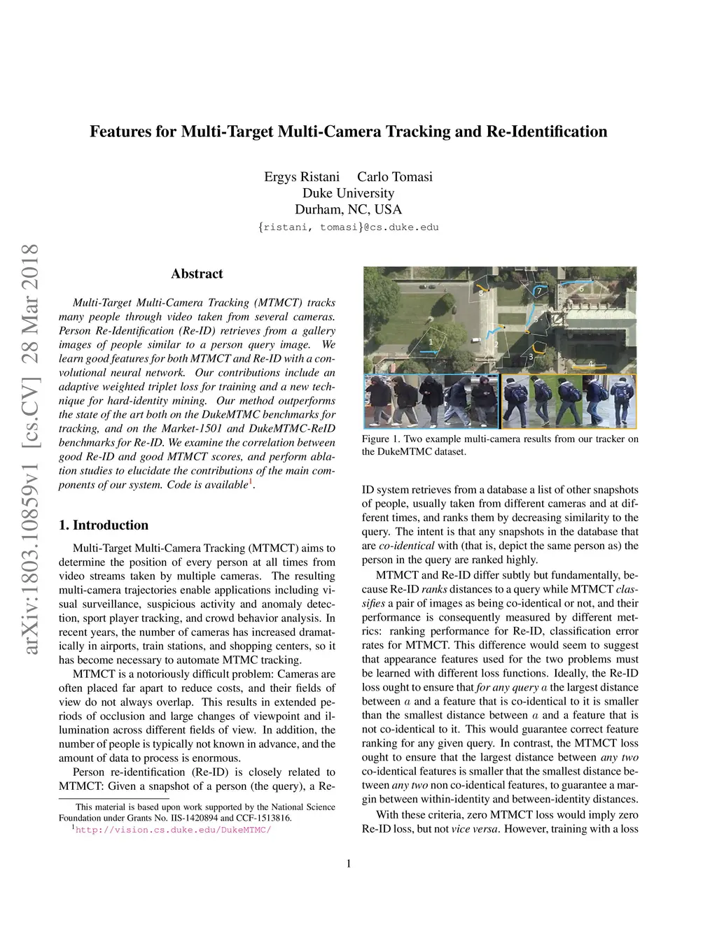 Multi-Target Multi-Camera Tracking (MTMCT) tracks many people through video taken from several cameras. Person Re-Identification (Re-ID) retrieves from a gallery images of people similar to a person query image. We learn good features for both MTMCT and Re-ID with a convolutional neural network. Our contributions include an adaptive weighted triplet loss for training and a new technique for hard-identity mining. Our method outperforms the state of the art both on the DukeMTMC benchmarks for tracking, and on the Market-1501 and DukeMTMC-ReID benchmarks for Re-ID. We examine the correlation between good Re-ID and good MTMCT scores, and perform ablation studies to elucidate the contributions of the main components of our system. Code is available.