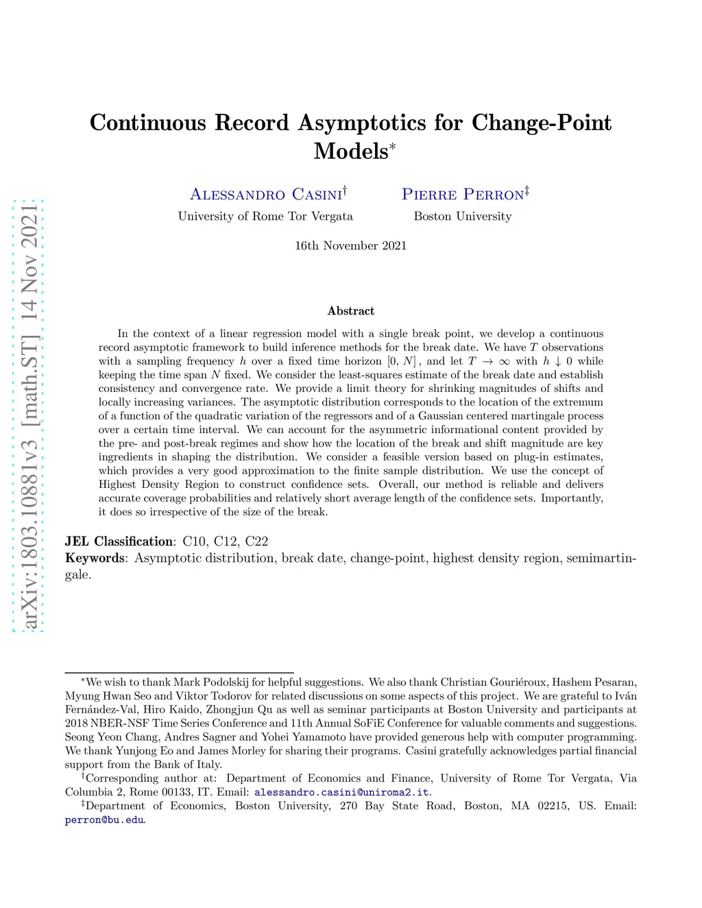 Continuous Record Asymptotics for Change-Points Models