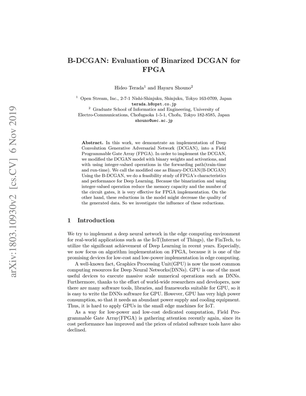 B-DCGAN:Evaluation of Binarized DCGAN for FPGA