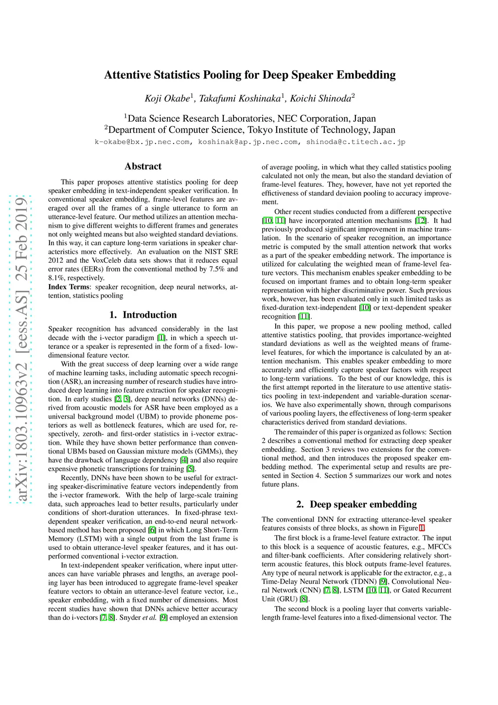 Attentive Statistics Pooling for Deep Speaker Embedding