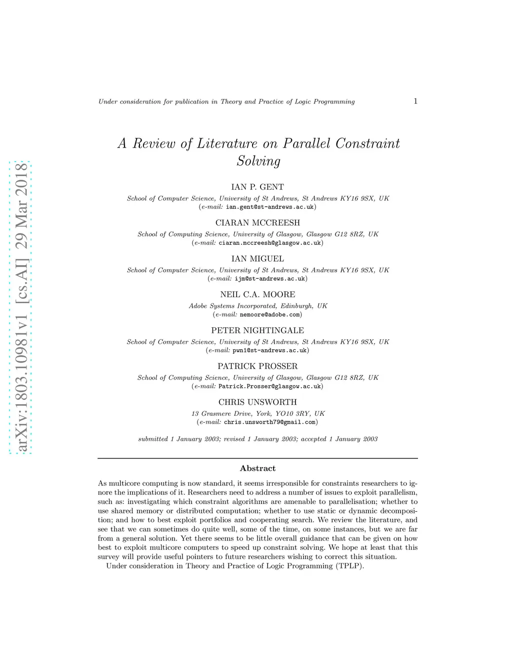A Review of Literature on Parallel Constraint Solving