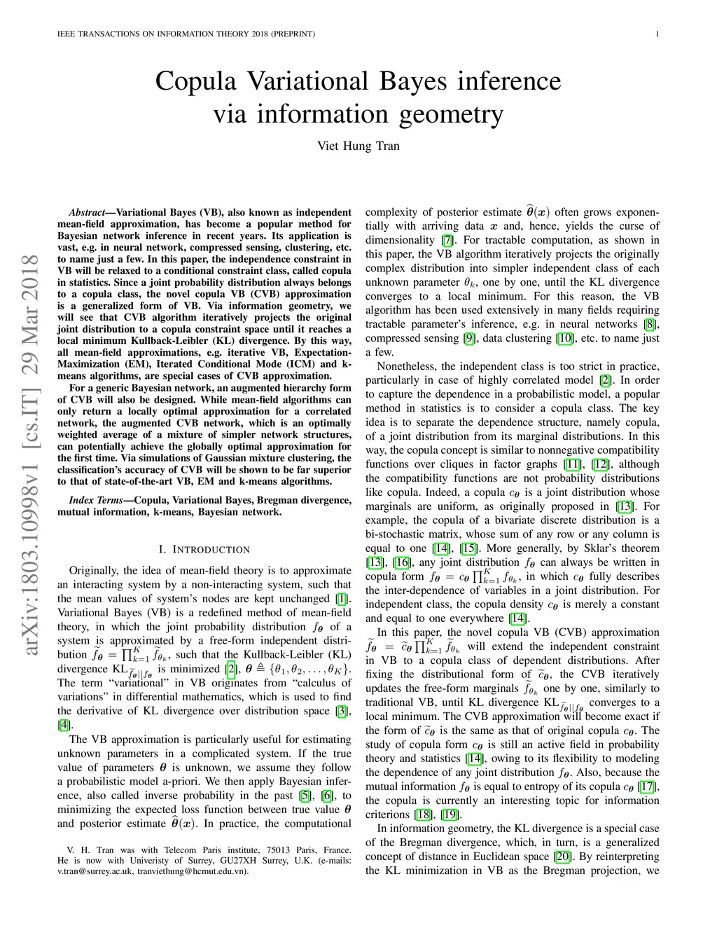 Variational Bayes (VB), also known as independent mean-field approximation, has become a popular method for Bayesian network inference in recent years. Its application is vast, e.g. in neural network, compressed sensing, clustering, etc. to name just a few. In this paper, the independence constraint in VB will be relaxed to a conditional constraint class, called copula in statistics. Since a joint probability distribution always belongs to a copula class, the novel copula VB (CVB) approximation is a generalized form of VB. Via information geometry, we will see that CVB algorithm iteratively projects the original joint distribution to a copula constraint space until it reaches a local minimum Kullback-Leibler (KL) divergence. By this way, all mean-field approximations, e.g. iterative VB, Expectation-Maximization (EM), Iterated Conditional Mode (ICM) and k-means algorithms, are special cases of CVB approximation. For a generic Bayesian network, an augmented hierarchy form of CVB will also be designed. While mean-field algorithms can only return a locally optimal approximation for a correlated network, the augmented CVB network, which is an optimally weighted average of a mixture of simpler network structures, can potentially achieve the globally optimal approximation for the first time. Via simulations of Gaussian mixture clustering, the classification's accuracy of CVB will be shown to be far superior to that of state-of-the-art VB, EM and k-means algorithms.