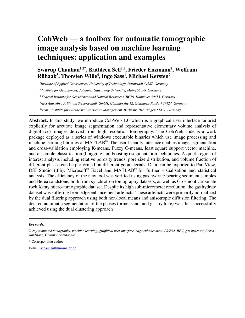 In this study, we introduce CobWeb 1.0 which is a graphical user interface tailored explicitly for accurate image segmentation and representative elementary volume analysis of digital rock images derived from high resolution tomography. The CobWeb code is a work package deployed as a series of windows executable binaries which use image processing and machine learning libraries of MATLAB. The user-friendly interface enables image segmentation and cross-validation employing K-means, Fuzzy C-means, least square support vector machine, and ensemble classification (bragging and boosting) segmentation techniques. A quick region of interest analysis including relative porosity trends, pore size distribution, and volume fraction of different phases can be performed on different geomaterials. Data can be exported to ParaView, DSI Studio (.fib), Microsoft Excel and MATLAB for further visualisation and statistical analysis. The efficiency of the new tool was verified using gas hydrate-bearing sediment samples and Berea sandstone, both from synchrotron tomography datasets, as well as Grosmont carbonate rock X-ray micro-tomographic dataset. Despite its high sub-micrometer resolution, the gas hydrate dataset was suffering from edge enhancement artefacts. These artefacts were primarily normalized by the dual filtering approach using both non-local means and anisotropic diffusion filtering. The desired automatic segmentation of the phases (brine, sand, and gas hydrate) was thus successfully achieved using the dual clustering approach.
