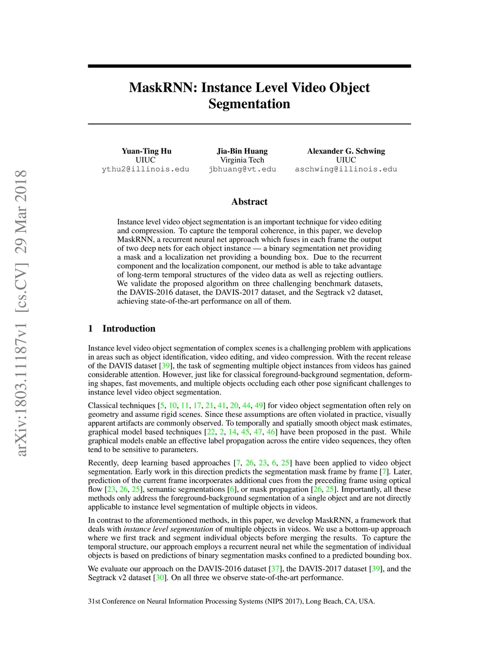 Instance level video object segmentation is an important technique for video editing and compression. To capture the temporal coherence, in this paper, we develop MaskRNN, a recurrent neural net approach which fuses in each frame the output of two deep nets for each object instance -- a binary segmentation net providing a mask and a localization net providing a bounding box. Due to the recurrent component and the localization component, our method is able to take advantage of long-term temporal structures of the video data as well as rejecting outliers. We validate the proposed algorithm on three challenging benchmark datasets, the DAVIS-2016 dataset, the DAVIS-2017 dataset, and the Segtrack v2 dataset, achieving state-of-the-art performance on all of them.