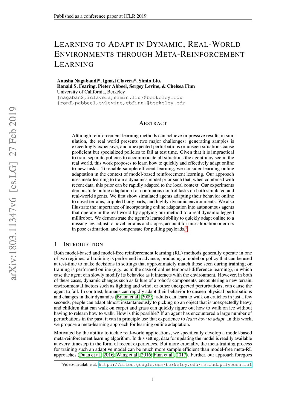 Although reinforcement learning methods can achieve impressive results in simulation, the real world presents two major challenges: generating samples is exceedingly expensive, and unexpected perturbations or unseen situations cause proficient but specialized policies to fail at test time. Given that it is impractical to train separate policies to accommodate all situations the agent may see in the real world, this work proposes to learn how to quickly and effectively adapt online to new tasks. To enable sample-efficient learning, we consider learning online adaptation in the context of model-based reinforcement learning. Our approach uses meta-learning to train a dynamics model prior such that, when combined with recent data, this prior can be rapidly adapted to the local context. Our experiments demonstrate online adaptation for continuous control tasks on both simulated and real-world agents. We first show simulated agents adapting their behavior online to novel terrains, crippled body parts, and highly-dynamic environments. We also illustrate the importance of incorporating online adaptation into autonomous agents that operate in the real world by applying our method to a real dynamic legged millirobot. We demonstrate the agent's learned ability to quickly adapt online to a missing leg, adjust to novel terrains and slopes, account for miscalibration or errors in pose estimation, and compensate for pulling payloads.
