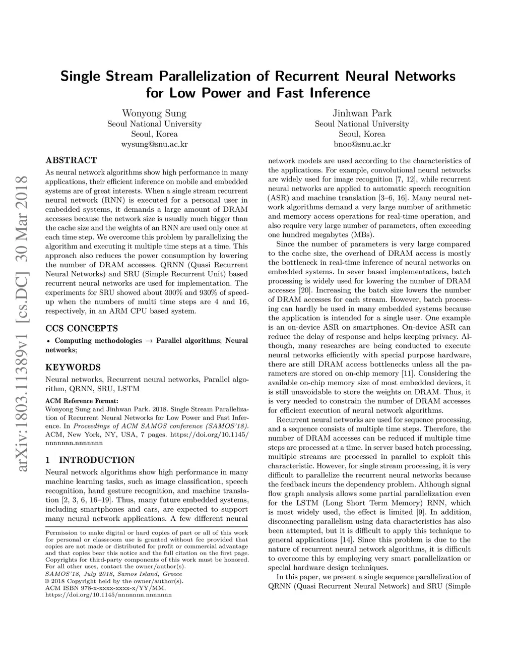 Single Stream Parallelization of Recurrent Neural Networks for Low Power
