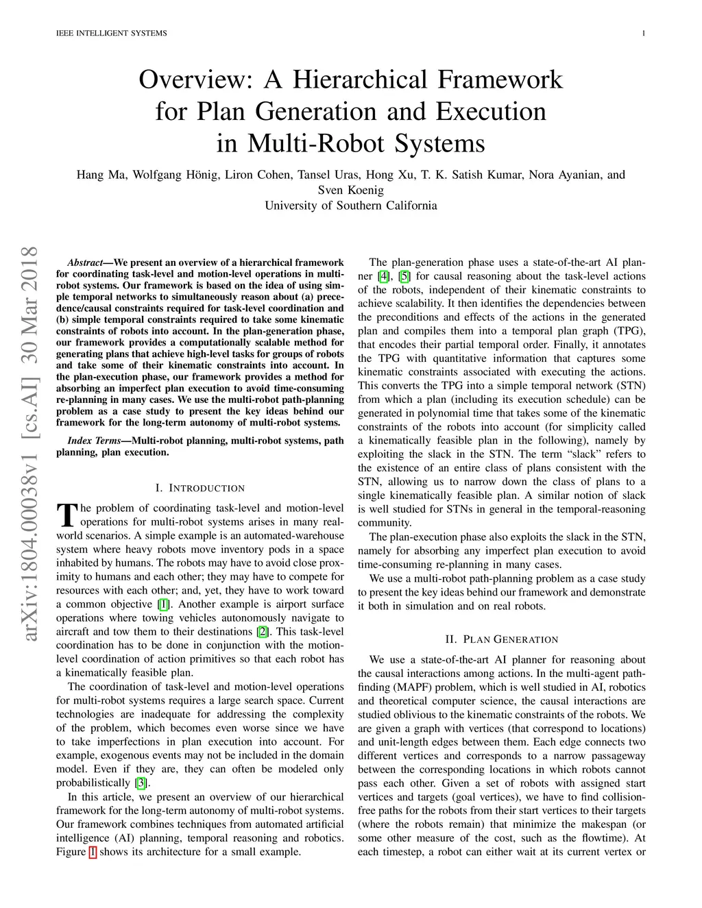 The authors present an overview of a hierarchical framework for coordinating task- and motion-level operations in multirobot systems. Their framework is based on the idea of using simple temporal networks to simultaneously reason about precedence/causal constraints required for task-level coordination and simple temporal constraints required to take some kinematic constraints of robots into account. In the plan-generation phase, the framework provides a computationally scalable method for generating plans that achieve high-level tasks for groups of robots and take some of their kinematic constraints into account. In the plan-execution phase, the framework provides a method for absorbing an imperfect plan execution to avoid time-consuming re-planning in many cases. The authors use the multirobot path-planning problem as a case study to present the key ideas behind their framework for the long-term autonomy of multirobot systems.