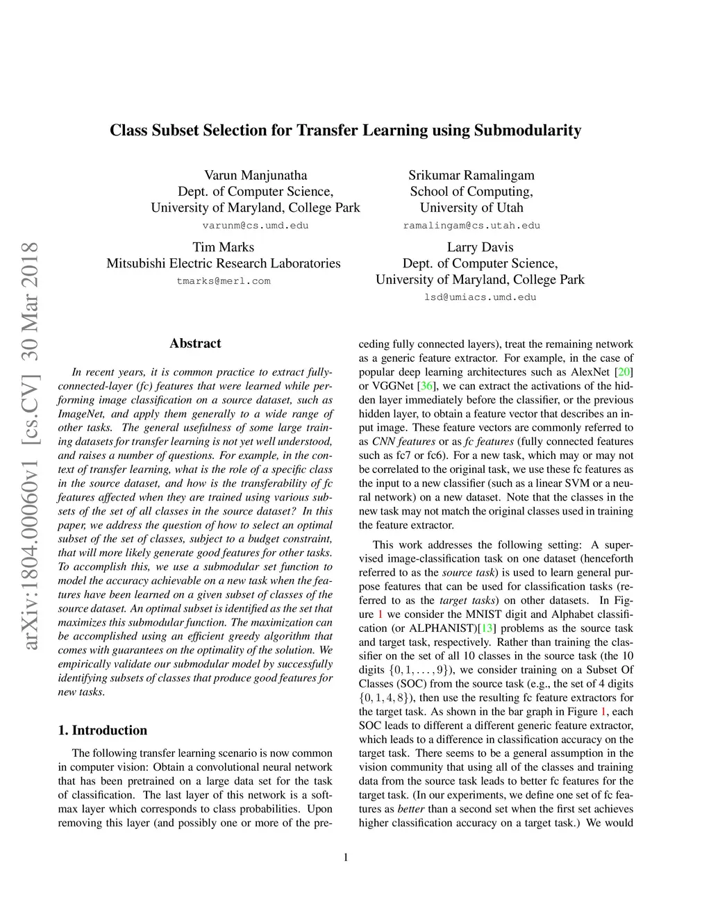 In recent years, it is common practice to extract fully-connected layer (fc) features that were learned while performing image classification on a source dataset, such as ImageNet, and apply them generally to a wide range of other tasks. The general usefulness of some large training datasets for transfer learning is not yet well understood, and raises a number of questions. For example, in the context of transfer learning, what is the role of a specific class in the source dataset, and how is the transferability of fc features affected when they are trained using various subsets of the set of all classes in the source dataset? In this paper, we address the question of how to select an optimal subset of the set of classes, subject to a budget constraint, that will more likely generate good features for other tasks. To accomplish this, we use a submodular set function to model the accuracy achievable on a new task when the features have been learned on a given subset of classes of the source dataset. An optimal subset is identified as the set that maximizes this submodular function. The maximization can be accomplished using an efficient greedy algorithm that comes with guarantees on the optimality of the solution. We empirically validate our submodular model by successfully identifying subsets of classes that produce good features for new tasks.