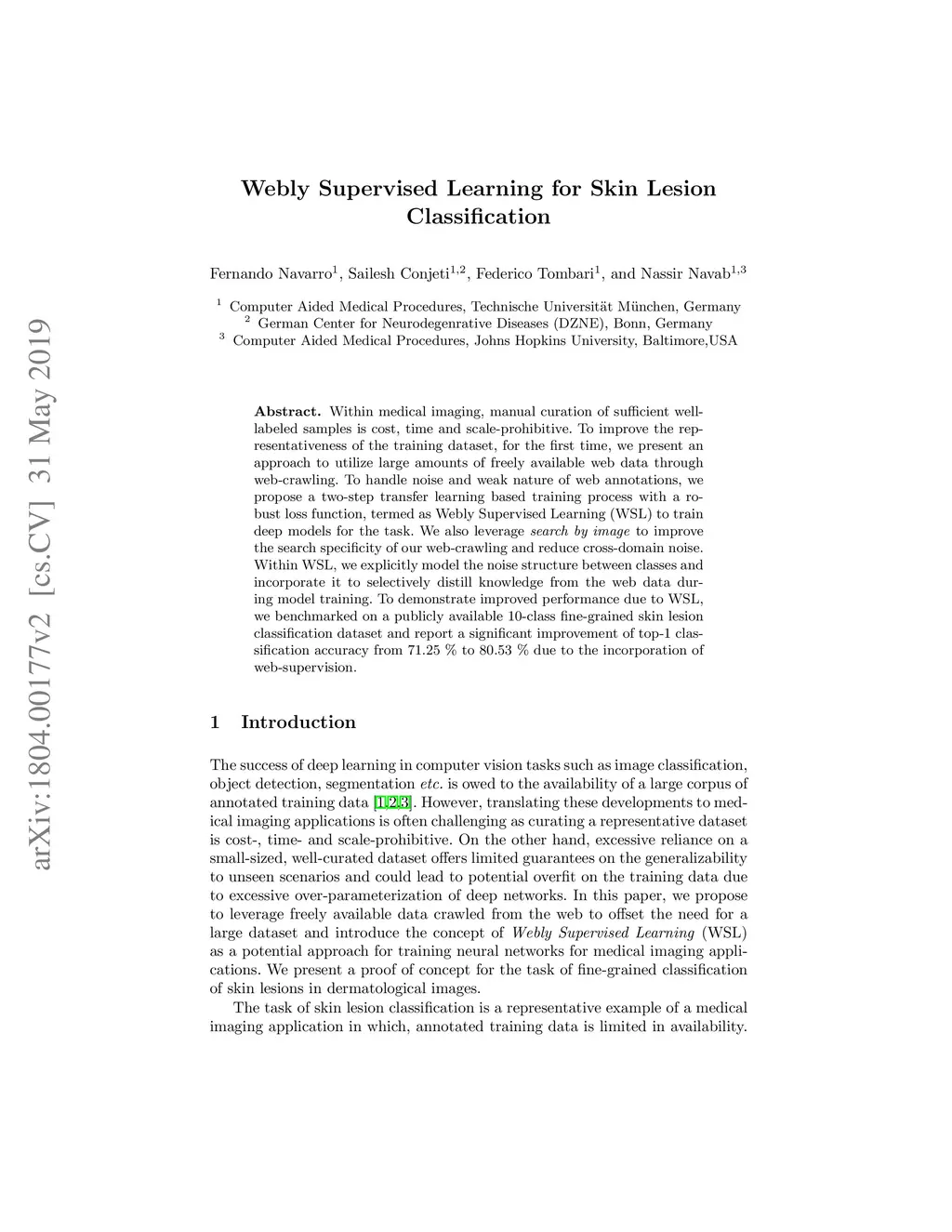 Within medical imaging, manual curation of sufficient well-labeled samples is cost, time and scale-prohibitive. To improve the representativeness of the training dataset, for the first time, we present an approach to utilize large amounts of freely available web data through web-crawling. To handle noise and weak nature of web annotations, we propose a two-step transfer learning based training process with a robust loss function, termed as Webly Supervised Learning (WSL) to train deep models for the task. We also leverage search by image to improve the search specificity of our web-crawling and reduce cross-domain noise. Within WSL, we explicitly model the noise structure between classes and incorporate it to selectively distill knowledge from the web data during model training. To demonstrate improved performance due to WSL, we benchmarked on a publicly available 10-class fine-grained skin lesion classification dataset and report a significant improvement of top-1 classification accuracy from 71.25 % to 80.53 % due to the incorporation of web-supervision.