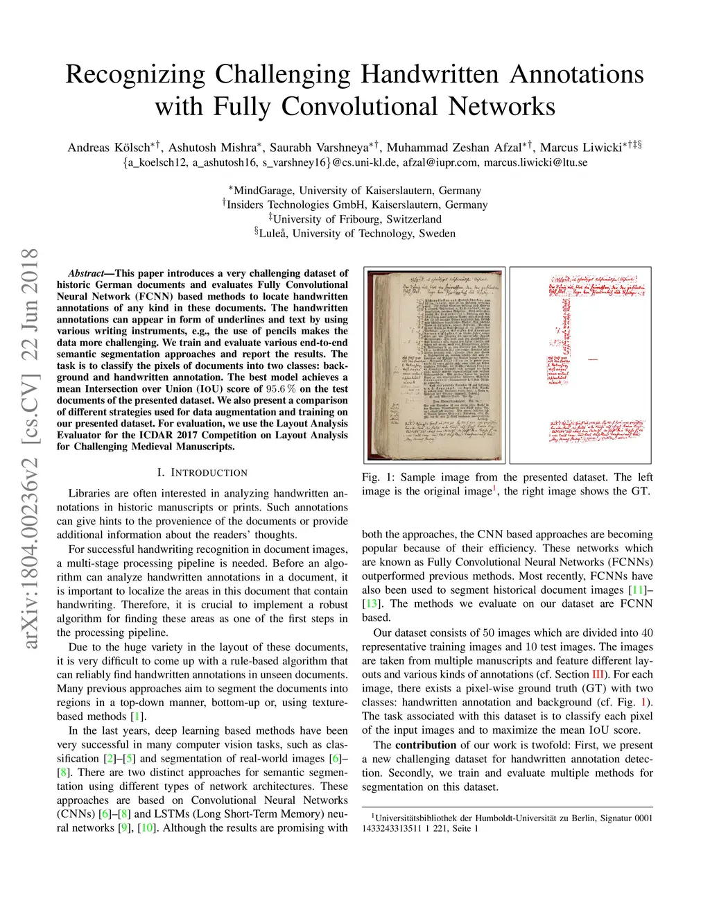 This paper introduces a very challenging dataset of historic German documents and evaluates Fully Convolutional Neural Network (FCNN) based methods to locate handwritten annotations of any kind in these documents. The handwritten annotations can appear in form of underlines and text by using various writing instruments, e.g., the use of pencils makes the data more challenging. We train and evaluate various end-to-end semantic segmentation approaches and report the results. The task is to classify the pixels of documents into two classes: background and handwritten annotation. The best model achieves a mean Intersection over Union (IoU) score of 95.6% on the test documents of the presented dataset. We also present a comparison of different strategies used for data augmentation and training on our presented dataset. For evaluation, we use the Layout Analysis Evaluator for the ICDAR 2017 Competition on Layout Analysis for Challenging Medieval Manuscripts.
