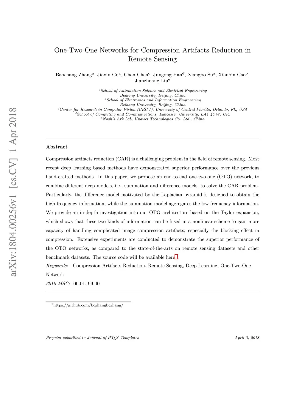 Compression artifacts reduction (CAR) is a challenging problem in the field of remote sensing. Most recent deep learning based methods have demonstrated superior performance over the previous hand-crafted methods. In this paper, we propose an end-to-end one-two-one (OTO) network, to combine different deep models, i.e., summation and difference models, to solve the CAR problem. Particularly, the difference model motivated by the Laplacian pyramid is designed to obtain the high frequency information, while the summation model aggregates the low frequency information. We provide an in-depth investigation into our OTO architecture based on the Taylor expansion, which shows that these two kinds of information can be fused in a nonlinear scheme to gain more capacity of handling complicated image compression artifacts, especially the blocking effect in compression. Extensive experiments are conducted to demonstrate the superior performance of the OTO networks, as compared to the state-of-the-arts on remote sensing datasets and other benchmark datasets.