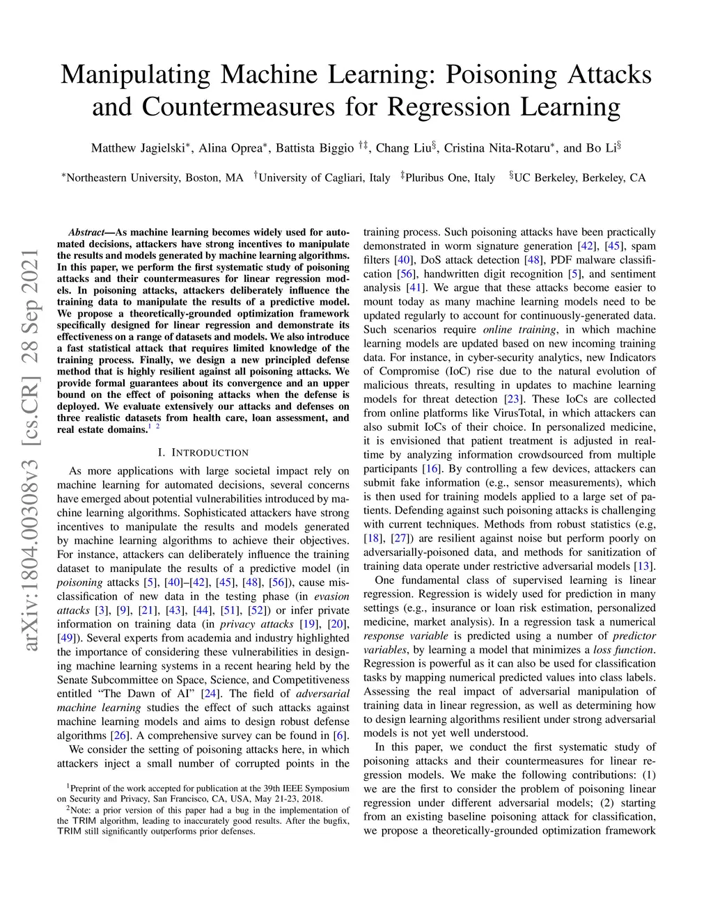 As machine learning becomes widely used for automated decisions, attackers have strong incentives to manipulate the results and models generated by machine learning algorithms. In this paper, we perform the first systematic study of poisoning attacks and their countermeasures for linear regression models. In poisoning attacks, attackers deliberately influence the training data to manipulate the results of a predictive model. We propose a theoretically-grounded optimization framework specifically designed for linear regression and demonstrate its effectiveness on a range of datasets and models. We also introduce a fast statistical attack that requires limited knowledge of the training process. Finally, we design a new principled defense method that is highly resilient against all poisoning attacks. We provide formal guarantees about its convergence and an upper bound on the effect of poisoning attacks when the defense is deployed. We evaluate extensively our attacks and defenses on three realistic datasets from health care, loan assessment, and real estate domains.