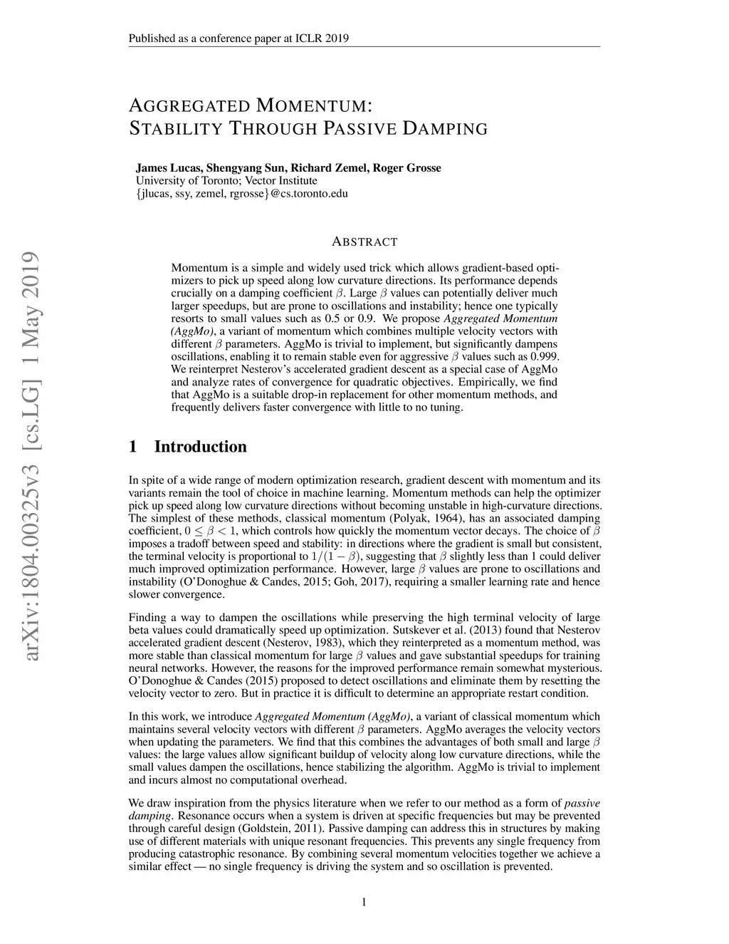 Momentum is a simple and widely used trick which allows gradient-based optimizers to pick up speed along low curvature directions. Its performance depends crucially on a damping coefficient . Large values can potentially deliver much larger speedups, but are prone to oscillations and instability; hence one typically resorts to small values such as 0.5 or 0.9. We propose Aggregated Momentum (AggMo), a variant of momentum which combines multiple velocity vectors with different parameters. AggMo is trivial to implement, but significantly dampens oscillations, enabling it to remain stable even for aggressive values such as 0.999. We reinterpret Nesterov's accelerated gradient descent as a special case of AggMo and analyze rates of convergence for quadratic objectives. Empirically, we find that AggMo is a suitable drop-in replacement for other momentum methods, and frequently delivers faster convergence.