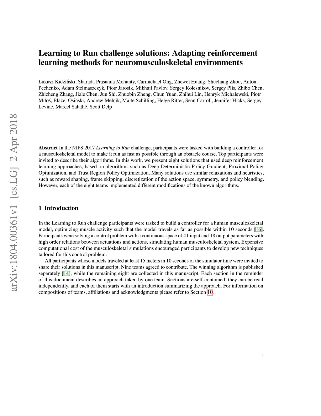In the NIPS 2017 Learning to Run challenge, participants were tasked with building a controller for a musculoskeletal model to make it run as fast as possible through an obstacle course. Top participants were invited to describe their algorithms. In this work, we present eight solutions that used deep reinforcement learning approaches, based on algorithms such as Deep Deterministic Policy Gradient, Proximal Policy Optimization, and Trust Region Policy Optimization. Many solutions use similar relaxations and heuristics, such as reward shaping, frame skipping, discretization of the action space, symmetry, and policy blending. However, each of the eight teams implemented different modifications of the known algorithms.