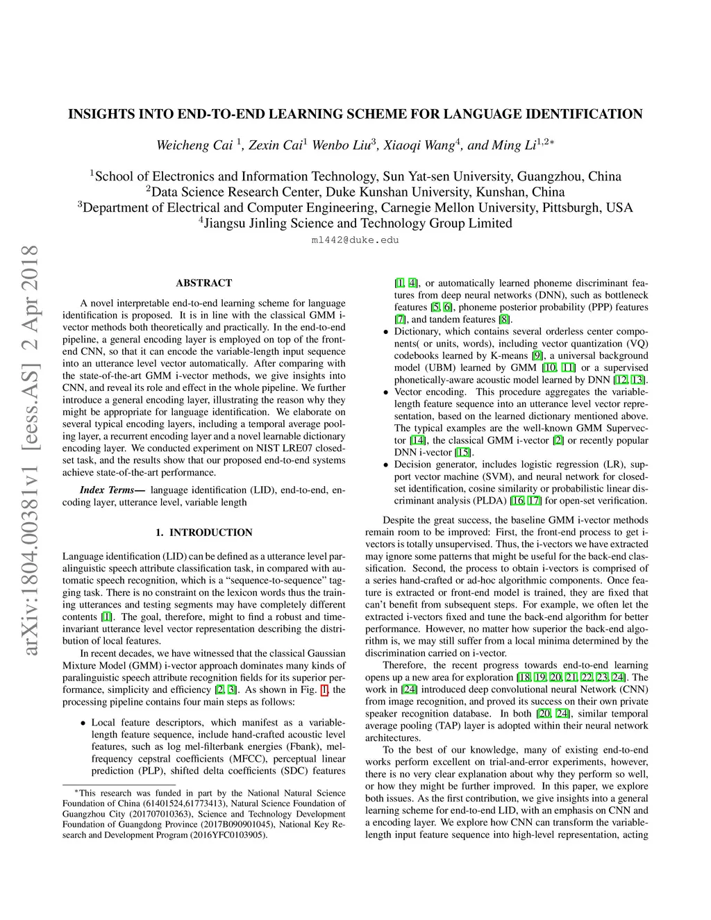 A novel interpretable end-to-end learning scheme for language identification is proposed. It is in line with the classical GMM i-vector methods both theoretically and practically. In the end-to-end pipeline, a general encoding layer is employed on top of the front-end CNN, so that it can encode the variable-length input sequence into an utterance level vector automatically. After comparing with the state-of-the-art GMM i-vector methods, we give insights into CNN, and reveal its role and effect in the whole pipeline. We further introduce a general encoding layer, illustrating the reason why they might be appropriate for language identification. We elaborate on several typical encoding layers, including a temporal average pooling layer, a recurrent encoding layer and a novel learnable dictionary encoding layer. We conducted experiment on NIST LRE07 closed-set task, and the results show that our proposed end-to-end systems achieve state-of-the-art performance.