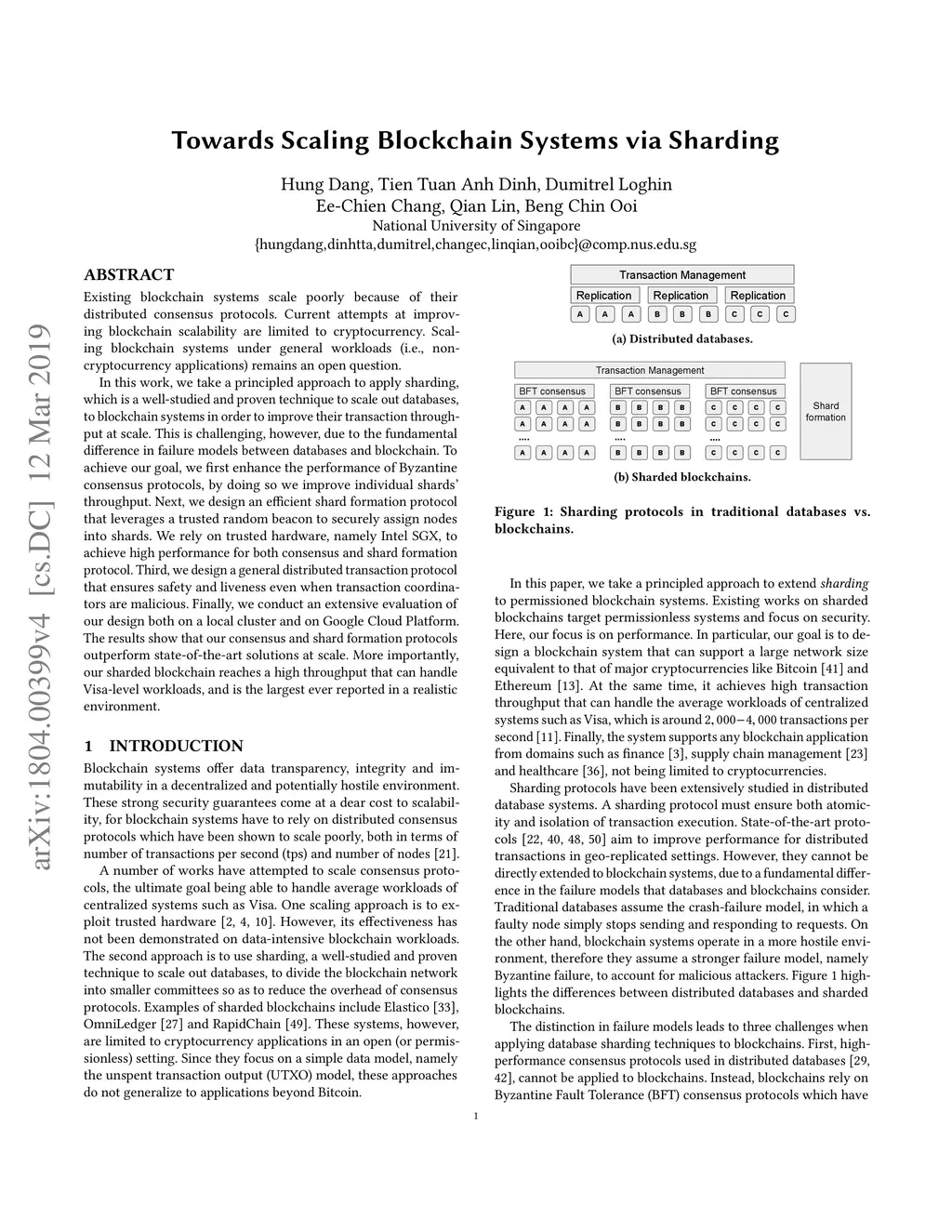 Existing blockchain systems scale poorly because of their distributed consensus protocols. Current attempts at improving blockchain scalability are limited to cryptocurrency. Scaling blockchain systems under general workloads (i.e., non-cryptocurrency applications) remains an open question. In this work, we take a principled approach to apply sharding, which is a well-studied and proven technique to scale out databases, to blockchain systems in order to improve their transaction throughput at scale. This is challenging, however, due to the fundamental difference in failure models between databases and blockchain. To achieve our goal, we first enhance the performance of Byzantine consensus protocols, by doing so we improve individual shards' throughput. Next, we design an efficient shard formation protocol that leverages a trusted random beacon to securely assign nodes into shards. We rely on trusted hardware, namely Intel SGX, to achieve high performance for both consensus and shard formation protocol. Third, we design a general distributed transaction protocol that ensures safety and liveness even when transaction coordinators are malicious. Finally, we conduct an extensive evaluation of our design both on a local cluster and on Google Cloud Platform. The results show that our consensus and shard formation protocols outperform state-of-the-art solutions at scale. More importantly, our sharded blockchain reaches a high throughput that can handle Visa-level workloads, and is the largest ever reported in a realistic environment.