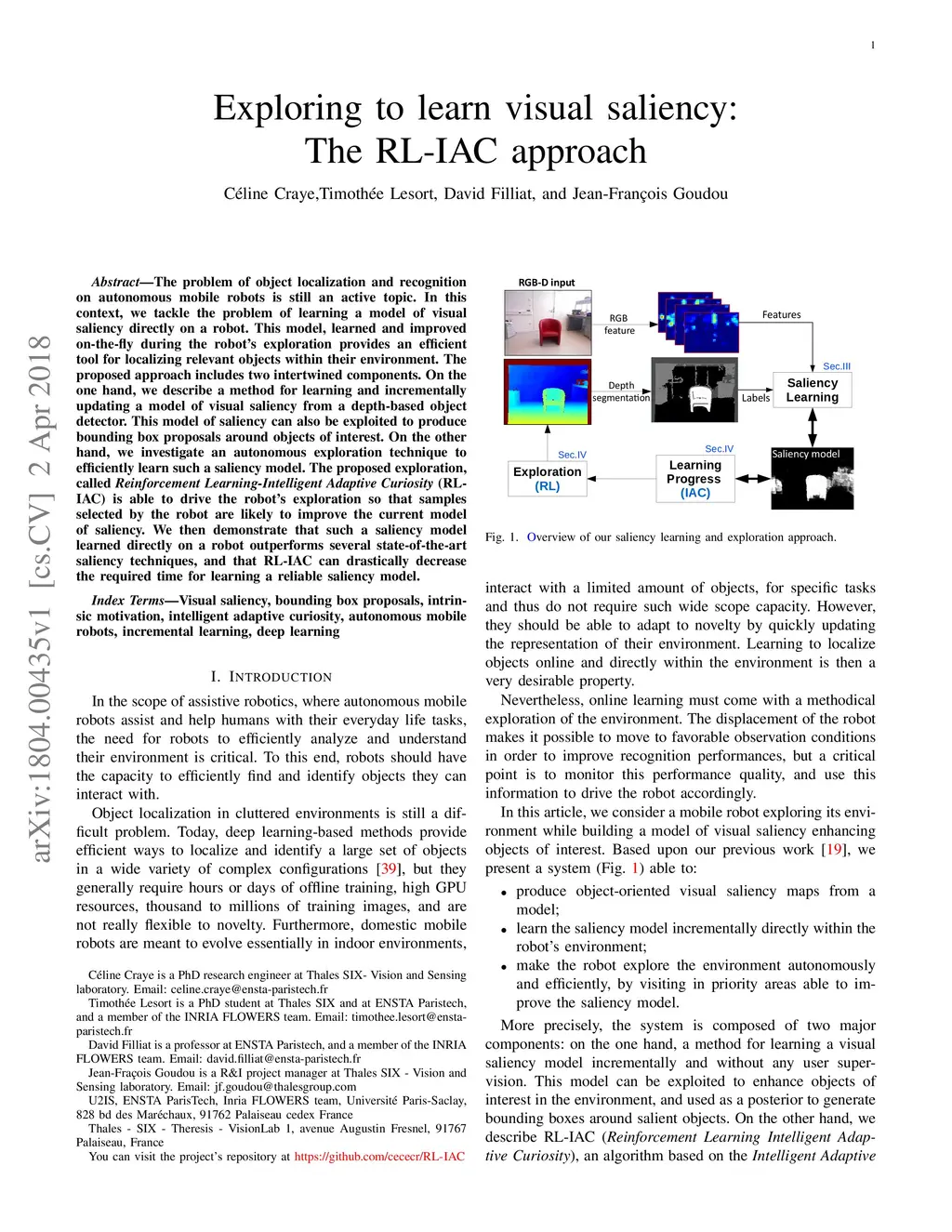 The problem of object localization and recognition on autonomous mobile robots is still an active topic. In this context, we tackle the problem of learning a model of visual saliency directly on a robot. This model, learned and improved on-the-fly during the robot's exploration provides an efficient tool for localizing relevant objects within their environment. The proposed approach includes two intertwined components. On the one hand, we describe a method for learning and incrementally updating a model of visual saliency from a depth-based object detector. This model of saliency can also be exploited to produce bounding box proposals around objects of interest. On the other hand, we investigate an autonomous exploration technique to efficiently learn such a saliency model. The proposed exploration, called Reinforcement Learning-Intelligent Adaptive Curiosity (RL-IAC) is able to drive the robot's exploration so that samples selected by the robot are likely to improve the current model of saliency. We then demonstrate that such a saliency model learned directly on a robot outperforms several state-of-the-art saliency techniques, and that RL-IAC can drastically decrease the required time for learning a reliable saliency model.