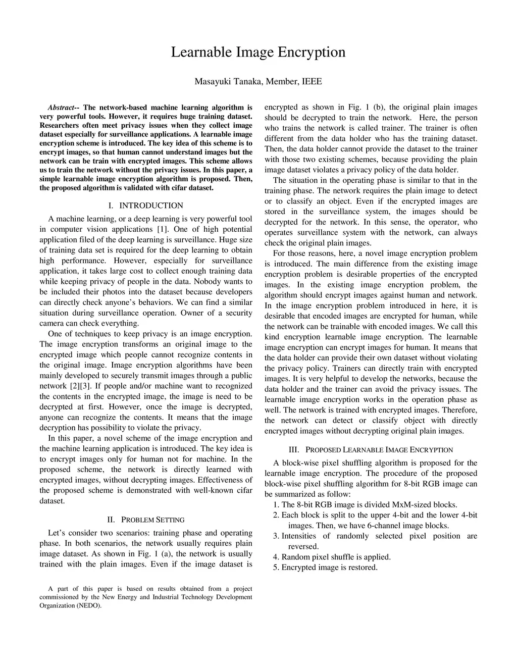 The network-based machine learning algorithm is very powerful tools. However, it requires huge training dataset. Researchers often meet privacy issues when they collect image dataset especially for surveillance applications. A learnable image encryption scheme is introduced. The key idea of this scheme is to encrypt images, so that human cannot understand images but the network can be train with encrypted images. This scheme allows us to train the network without the privacy issues. In this paper, a simple learnable image encryption algorithm is proposed. Then, the proposed algorithm is validated with cifar dataset.