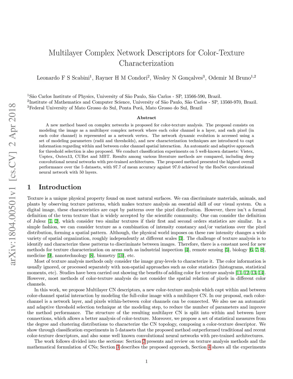 Multilayer Complex Network Descriptors for Color-Texture