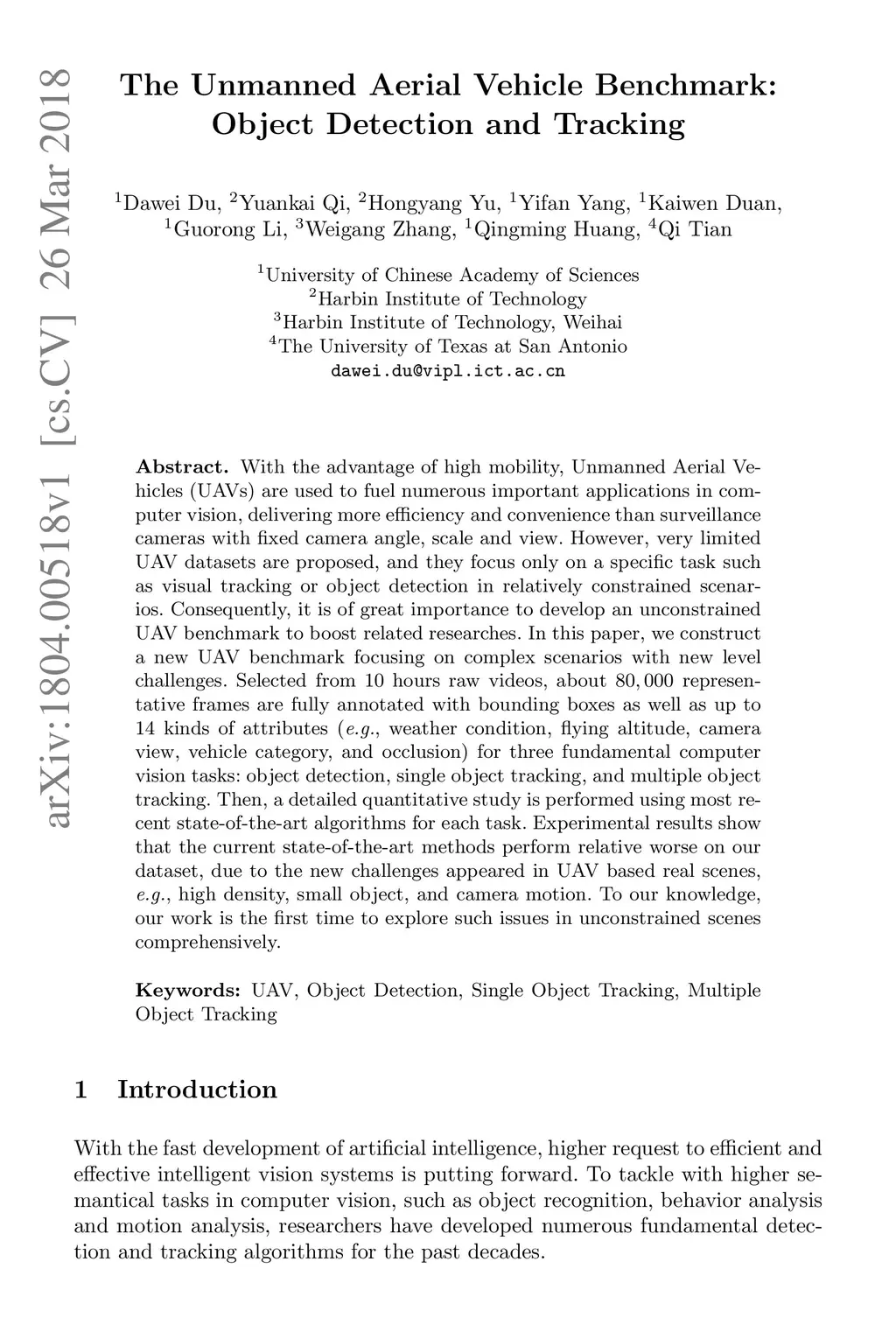 With the advantage of high mobility, Unmanned Aerial Vehicles (UAVs) are used to fuel numerous important applications in computer vision, delivering more efficiency and convenience than surveillance cameras with fixed camera angle, scale and view. However, very limited UAV datasets are proposed, and they focus only on a specific task such as visual tracking or object detection in relatively constrained scenarios. Consequently, it is of great importance to develop an unconstrained UAV benchmark to boost related researches. In this paper, we construct a new UAV benchmark focusing on complex scenarios with new level challenges. Selected from 10 hours raw videos, about 80,000 representative frames are fully annotated with bounding boxes as well as up to 14 kinds of attributes (e.g., weather condition, flying altitude, camera view, vehicle category, and occlusion) for three fundamental computer vision tasks: object detection, single object tracking, and multiple object tracking. Then, a detailed quantitative study is performed using most recent state-of-the-art algorithms for each task. Experimental results show that the current state-of-the-art methods perform relative worse on our dataset, due to the new challenges appeared in UAV based real scenes, e.g., high density, small object, and camera motion. To our knowledge, our work is the first time to explore such issues in unconstrained scenes comprehensively.