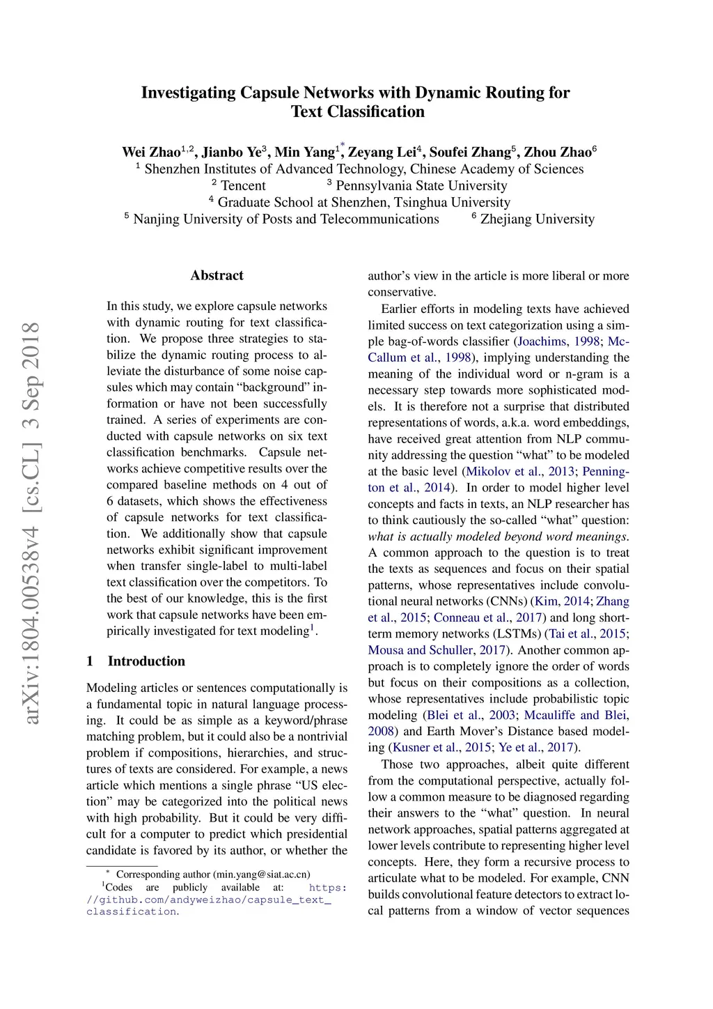 In this study, we explore capsule networks with dynamic routing for text classification. We propose three strategies to stabilize the dynamic routing process to alleviate the disturbance of some noise capsules which may contain "background" information or have not been successfully trained. A series of experiments are conducted with capsule networks on six text classification benchmarks. Capsule networks achieve state of the art on 4 out of 6 datasets, which shows the effectiveness of capsule networks for text classification. We additionally show that capsule networks exhibit significant improvement when transfer single-label to multi-label text classification over strong baseline methods. To the best of our knowledge, this is the first work that capsule networks have been empirically investigated for text modeling.