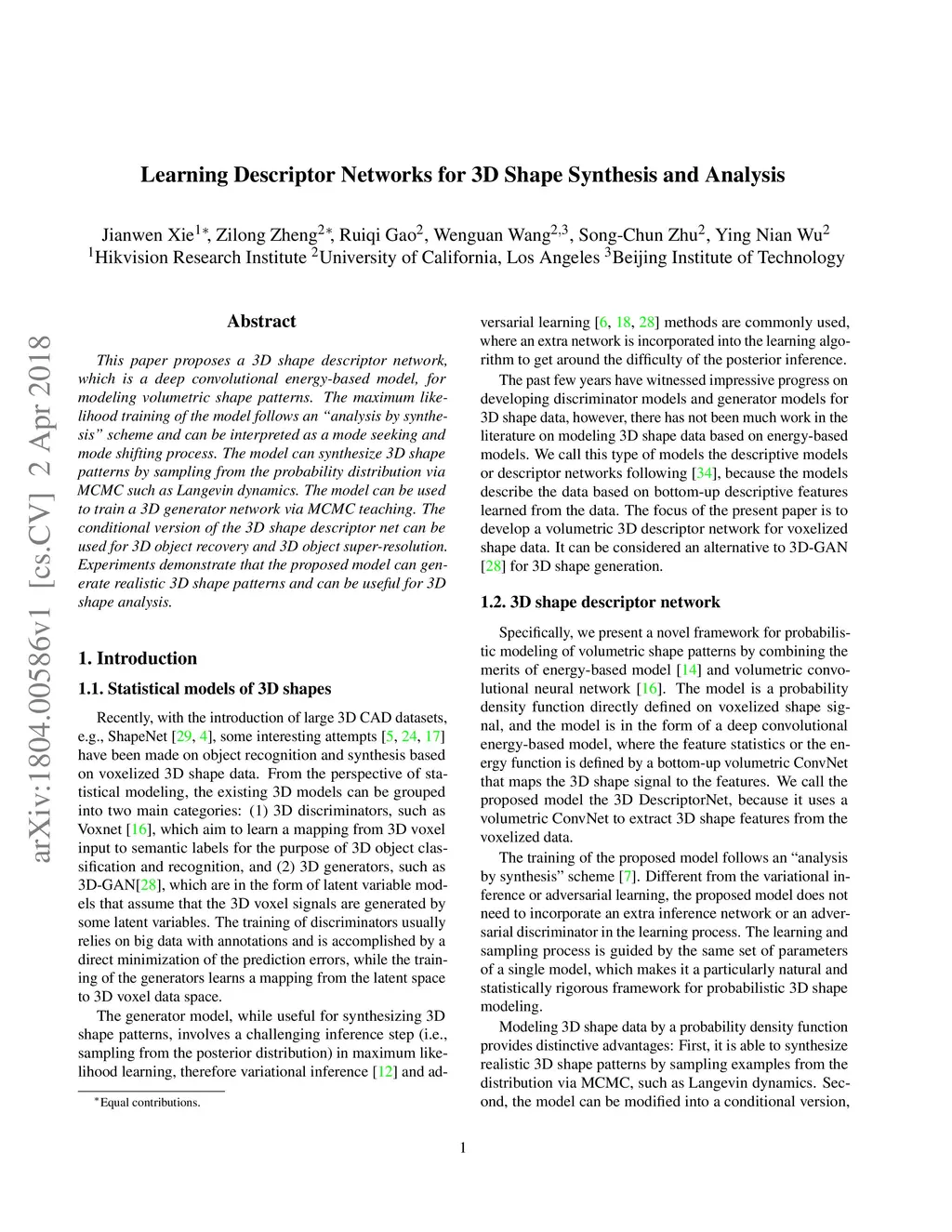 Learning Descriptor Networks for 3D Shape Synthesis and Analysis