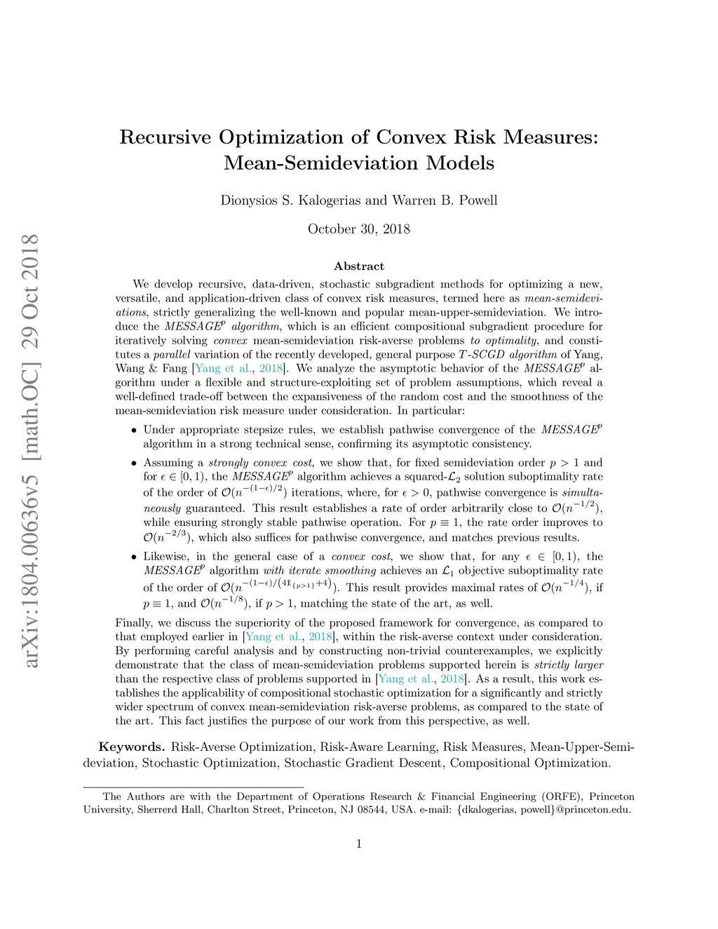 We develop recursive, data-driven, stochastic subgradient methods for optimizing a new, versatile, and application-driven class of convex risk measures, termed here as mean-semideviations, strictly generalizing the well-known and popular mean-upper-semideviation. We introduce the MESSAGEp algorithm, which is an efficient compositional subgradient procedure for iteratively solving convex mean-semideviation risk-averse problems to optimality. We analyze the asymptotic behavior of the MESSAGEp algorithm under a flexible and structure-exploiting set of problem assumptions. In particular: 1) Under appropriate stepsize rules, we establish pathwise convergence of the MESSAGEp algorithm in a strong technical sense, confirming its asymptotic consistency. 2) Assuming a strongly convex cost, we show that, for fixed semideviation order and for , the MESSAGEp algorithm achieves a squared- solution suboptimality rate of the order of iterations, where, for , pathwise convergence is simultaneously guaranteed. This result establishes a rate of order arbitrarily close to , while ensuring strongly stable pathwise operation. For , the rate order improves to , which also suffices for pathwise convergence, and matches previous results. 3) Likewise, in the general case of a convex cost, we show that, for any , the MESSAGEp algorithm with iterate smoothing achieves an objective suboptimality rate of the order of iterations. This result provides maximal rates of , if , and , if , matching the state of the art, as well.