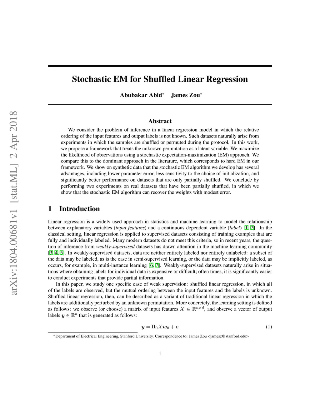 We consider the problem of inference in a linear regression model in which the relative ordering of the input features and output labels is not known. Such datasets naturally arise from experiments in which the samples are shuffled or permuted during the protocol. In this work, we propose a framework that treats the unknown permutation as a latent variable. We maximize the likelihood of observations using a stochastic expectation-maximization (EM) approach. We compare this to the dominant approach in the literature, which corresponds to hard EM in our framework. We show on synthetic data that the stochastic EM algorithm we develop has several advantages, including lower parameter error, less sensitivity to the choice of initialization, and significantly better performance on datasets that are only partially shuffled. We conclude by performing two experiments on real datasets that have been partially shuffled, in which we show that the stochastic EM algorithm can recover the weights with modest error.