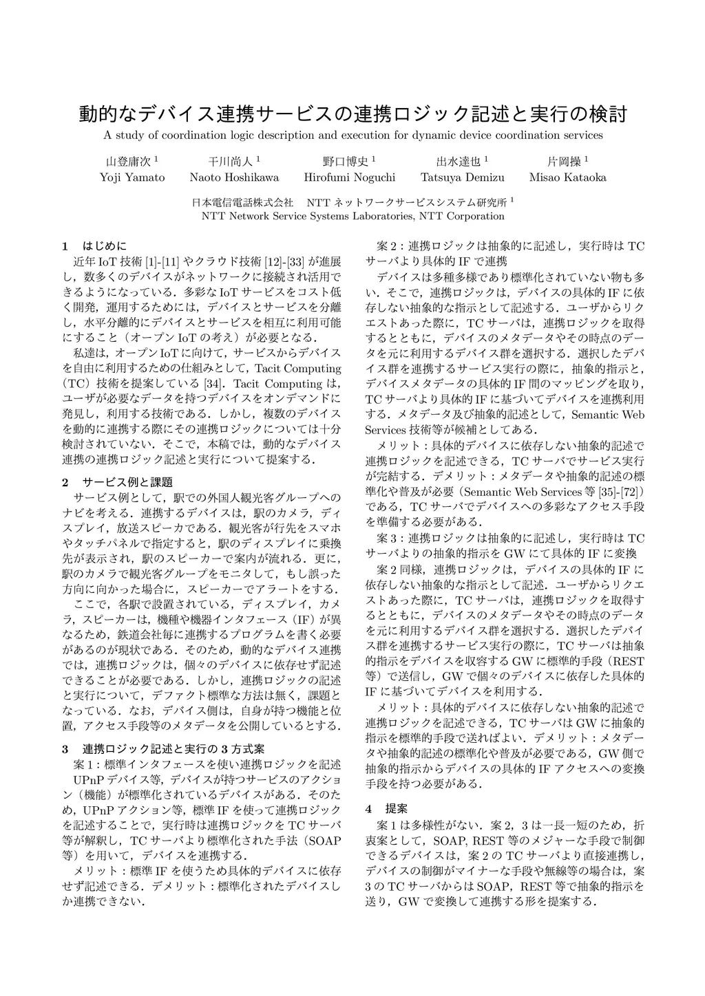 Recently, IoT technologies have been progressed, and many devices are connected to networks. Previously, IoT services were developed by vertical integration style. But now Open IoT concept has attracted attentions which achieves various IoT services by integrating horizontal separated devices and services. For Open IoT era, we have proposed the Tacit Computing technology to discover the devices with necessary data for users on demand and use them dynamically. Although Tacit Computing can discover and use the device based on the situation, a study of coordination logic description is insufficient when multiple devices are coordinated. In this paper, we study coordination logic description and execution to coordinate multiple devices dynamically. We compare methods with ideas to convert abstract description to specific interface access means at execution time, study merits and demerits and propose an appropriate method.