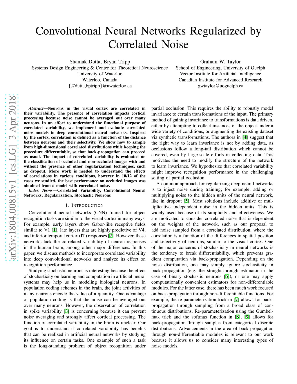 Neurons in the visual cortex are correlated in their variability. The presence of correlation impacts cortical processing because noise cannot be averaged out over many neurons. In an effort to understand the functional purpose of correlated variability, we implement and evaluate correlated noise models in deep convolutional neural networks. Inspired by the cortex, correlation is defined as a function of the distance between neurons and their selectivity. We show how to sample from high-dimensional correlated distributions while keeping the procedure differentiable, so that back-propagation can proceed as usual. The impact of correlated variability is evaluated on the classification of occluded and non-occluded images with and without the presence of other regularization techniques, such as dropout. More work is needed to understand the effects of correlations in various conditions, however in 10/12 of the cases we studied, the best performance on occluded images was obtained from a model with correlated noise.