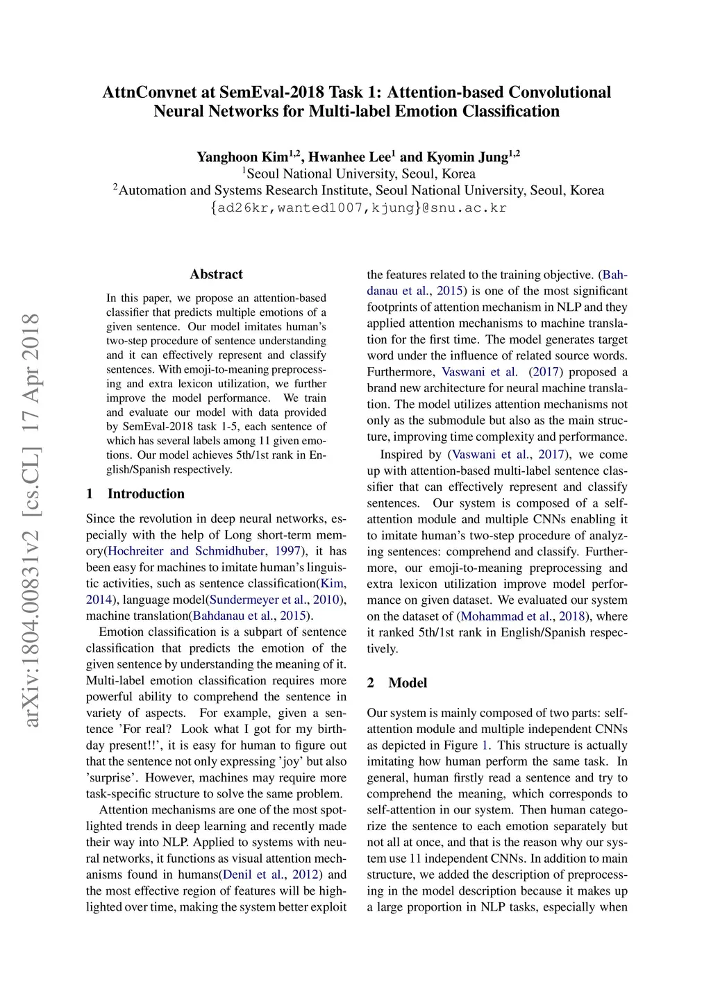 In this paper, we propose an attention-based classifier that predicts multiple emotions of a given sentence. Our model imitates human's two-step procedure of sentence understanding and it can effectively represent and classify sentences. With emoji-to-meaning preprocessing and extra lexicon utilization, we further improve the model performance. We train and evaluate our model with data provided by SemEval-2018 task 1-5, each sentence of which has several labels among 11 given sentiments. Our model achieves 5-th/1-th rank in English/Spanish respectively.
